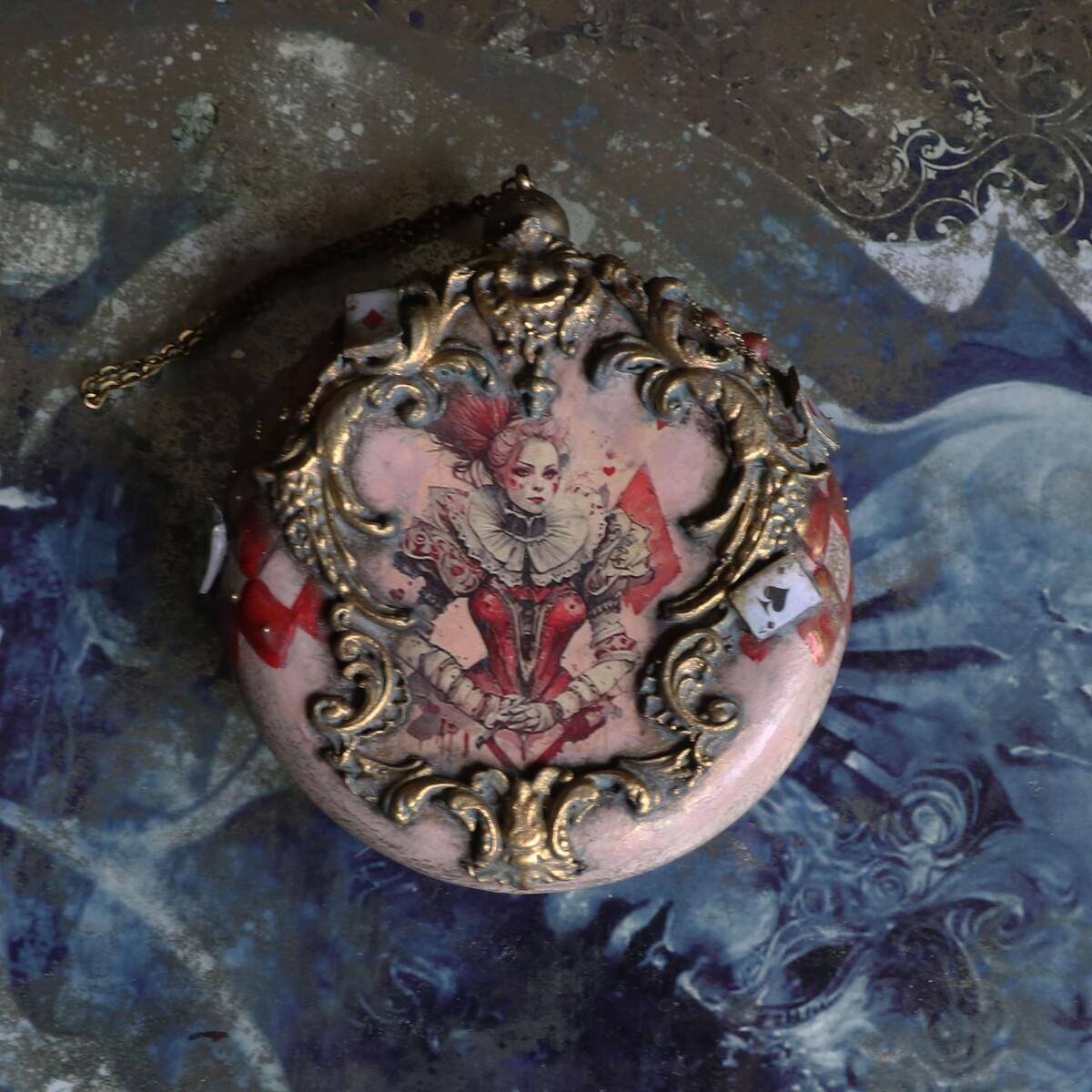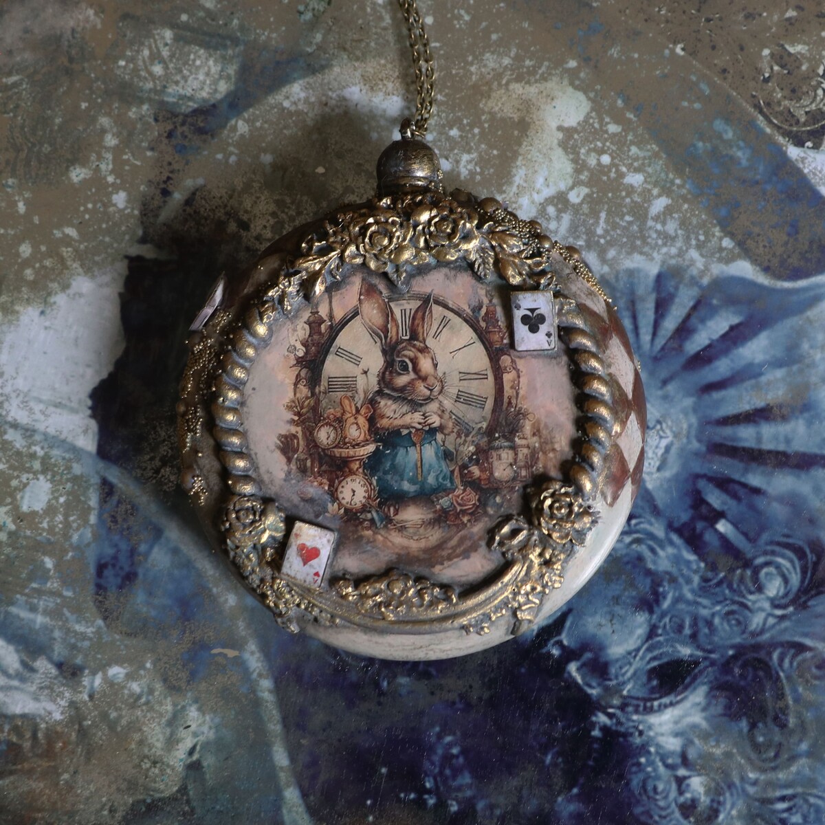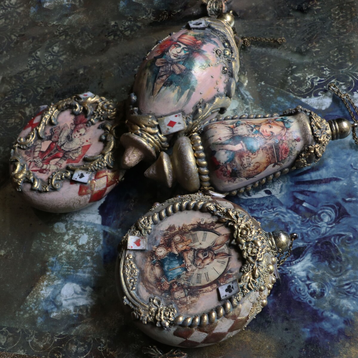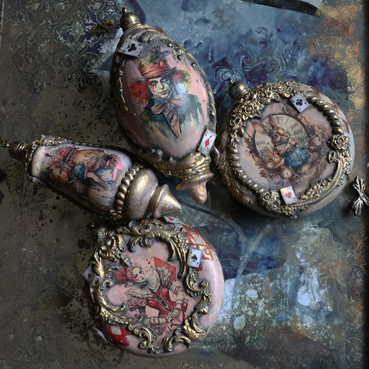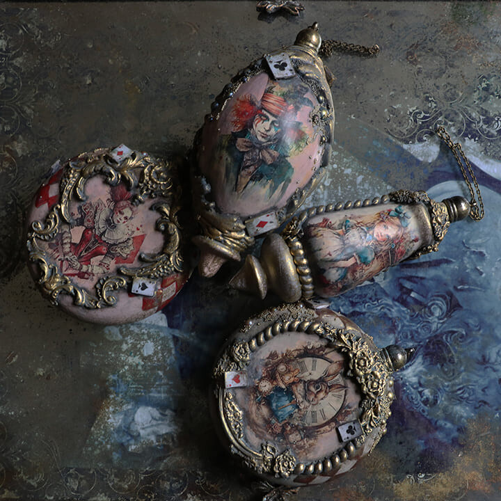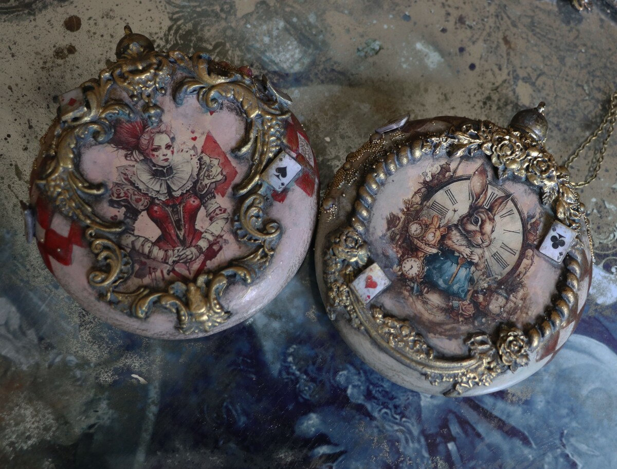 Сказка в жанре абсурда Алиса в стране чудес, послужила мотивом к созданию мастер класса по декору набора новогодних игрушек.