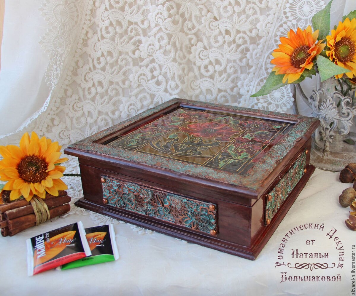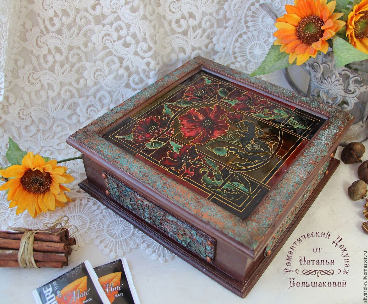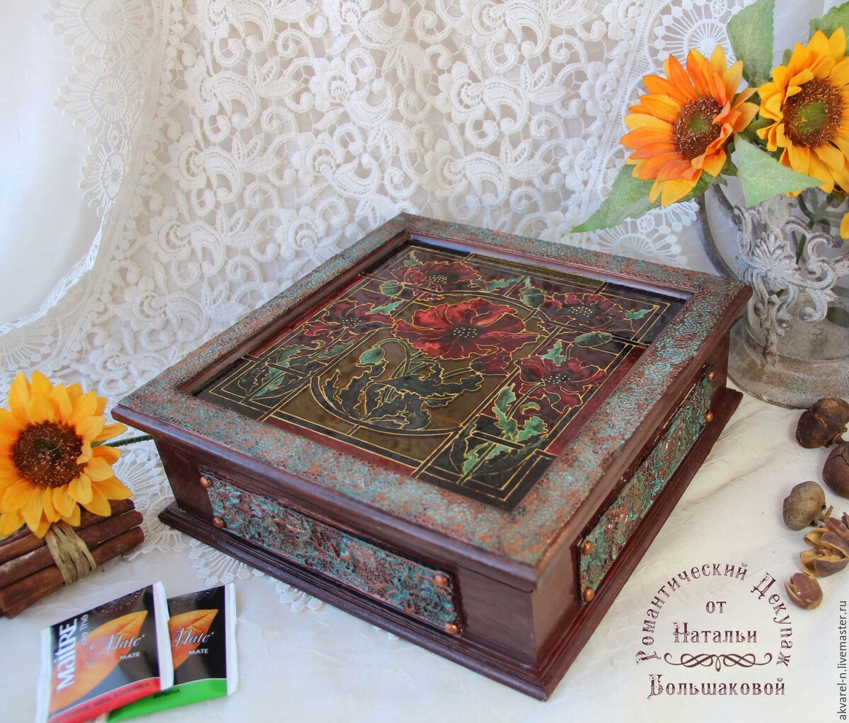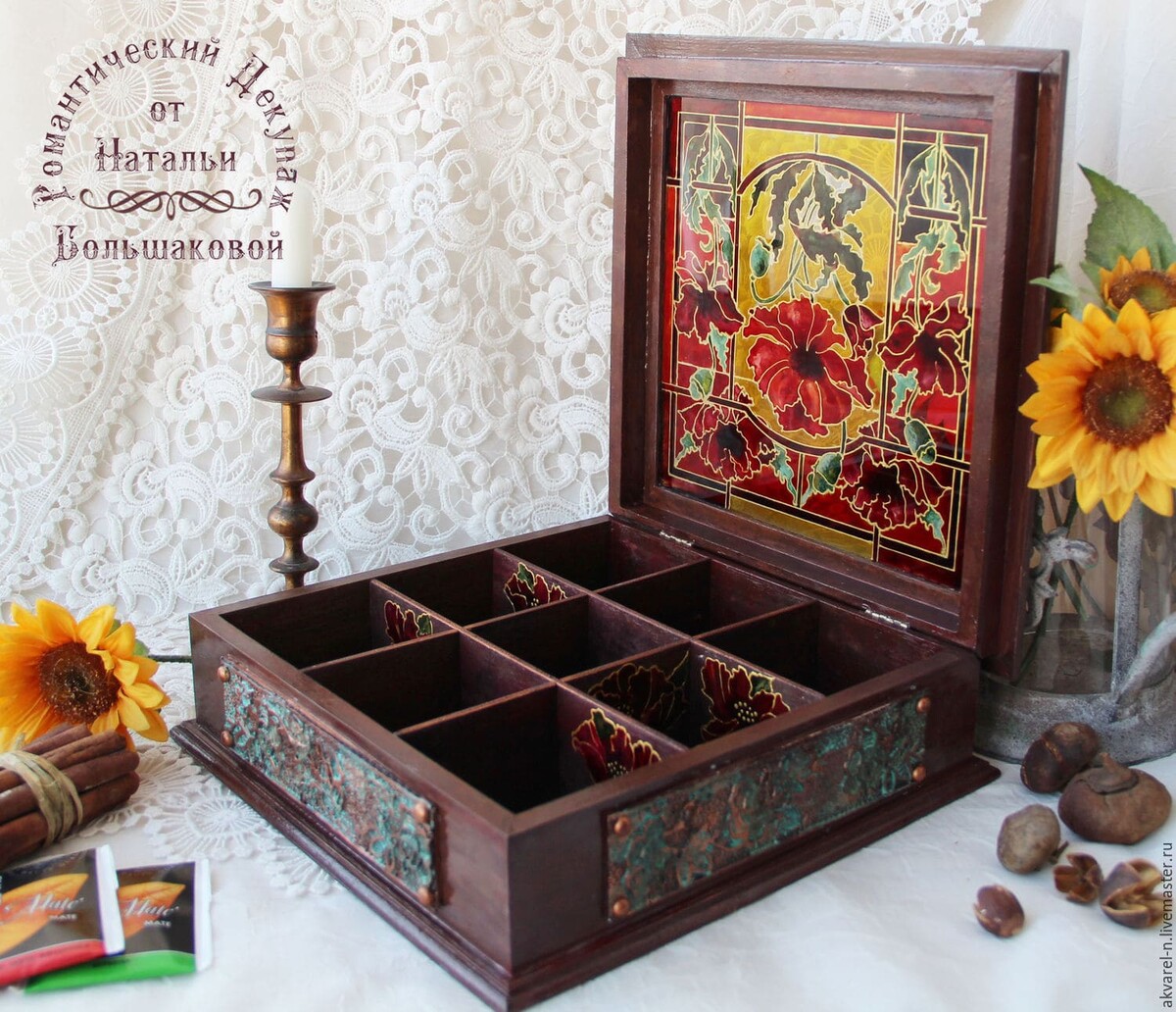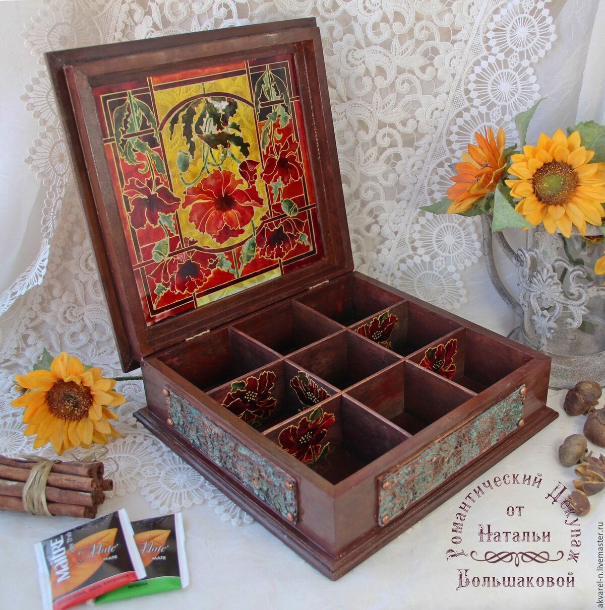 Очень большая и вместительная шкатулка для чайных пакетиков или рукоделия, на 9 отделений, станет истинным украшением любого дома. Крышка шкатулки, с удивительными маками, на стеклянной вставке, расписана витражными красками.Рисунок яркий, маки обладают довольно-таки сильной энергией, чем охотно делятся с человеком. Благодаря ему можно обрести уверенность в себе, стать более целеустремленным, успешным, коммуникабельным и энергичным. Однако главный смысл и значение, которые заключены в маке по Фен шуй, кроются в его благоприятном воздействии на любовную сферу жизни.