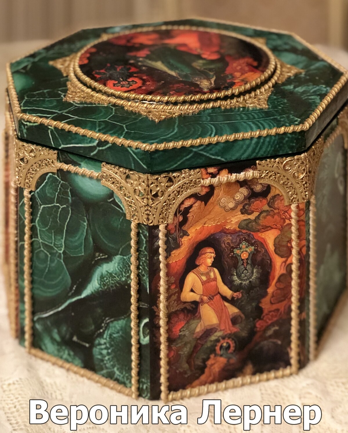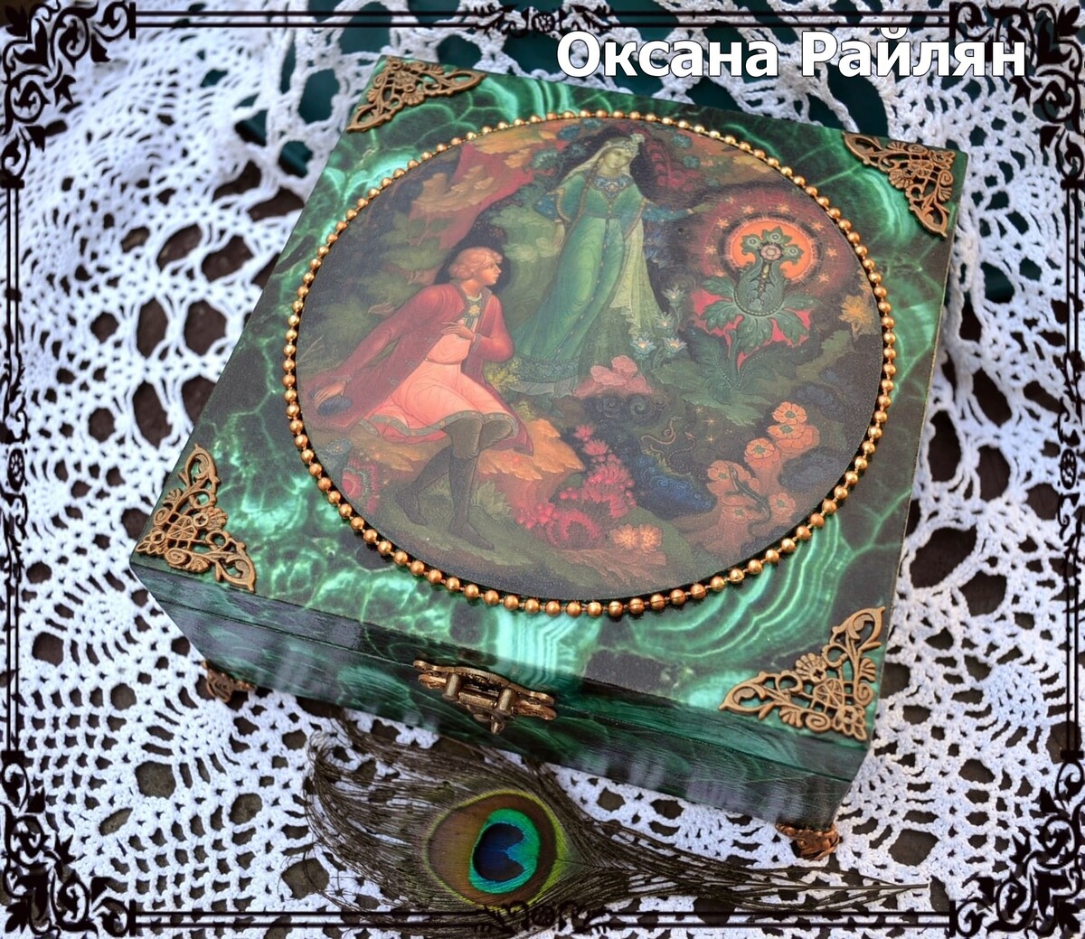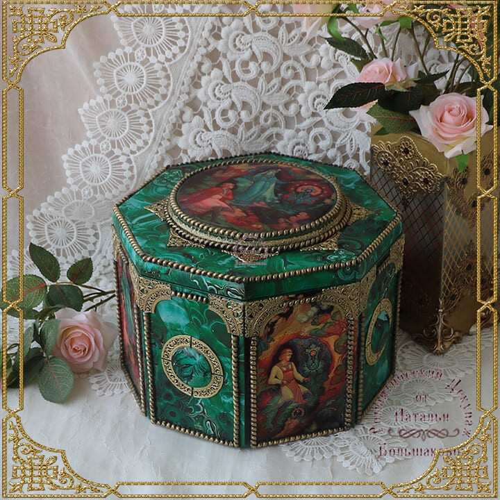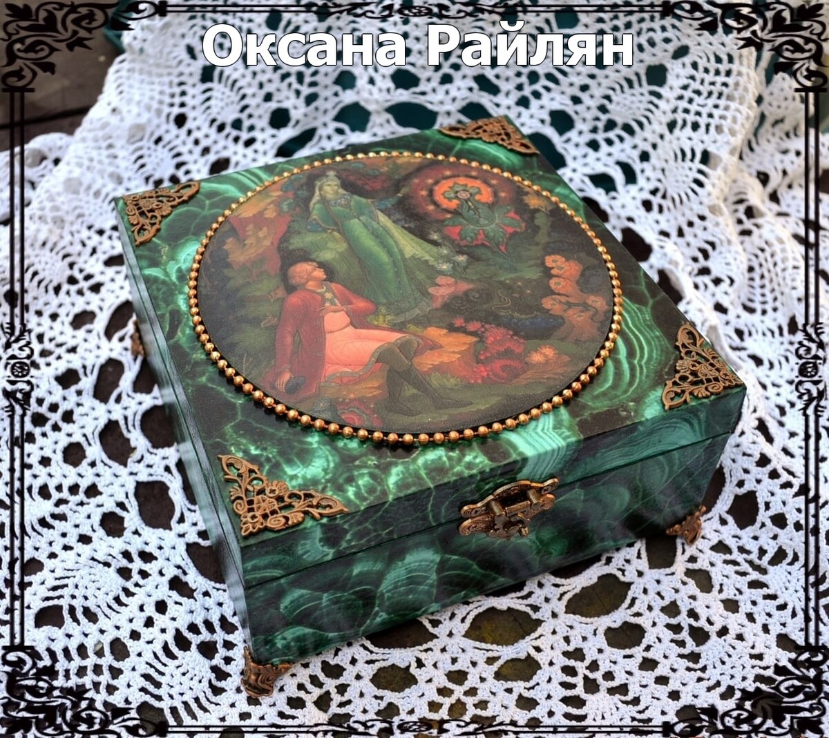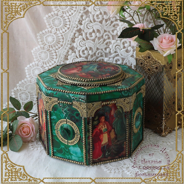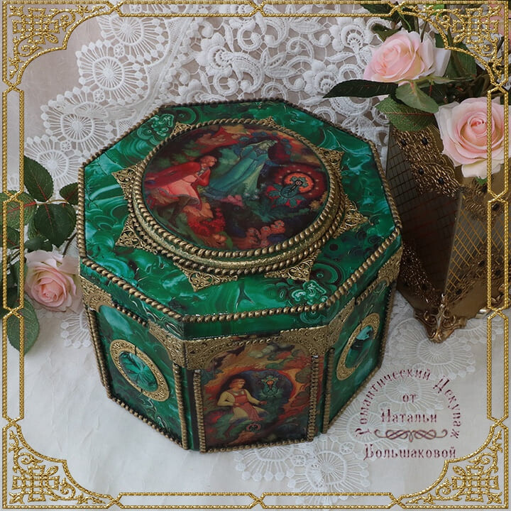 Куда же мы без малахитовых драгоценных самоцветов, которые завораживают глубоким зеленым цветом и причудливыми узорами! Воссоздать эту красоту «рукотворно» просто нереально, поэтому работаем с декупажной картой.