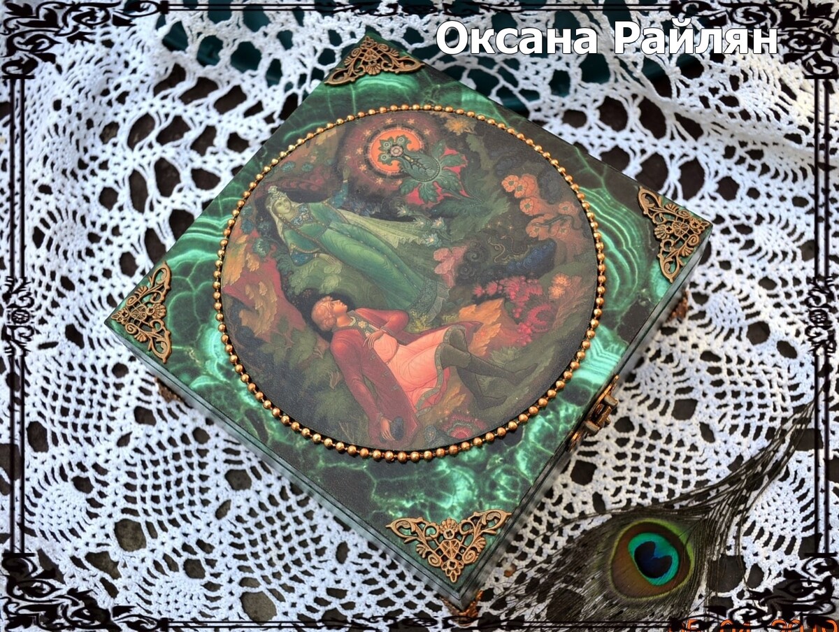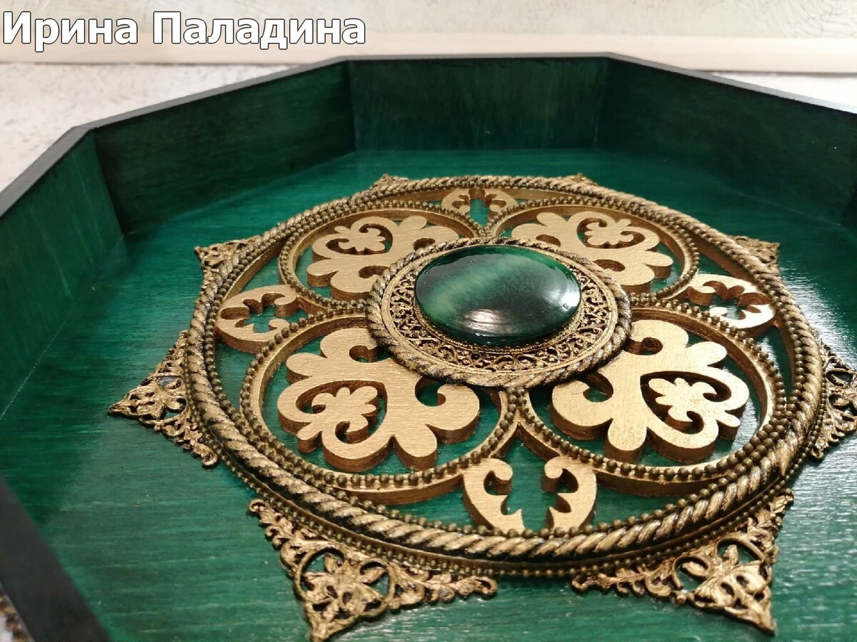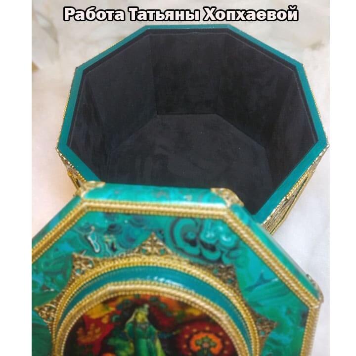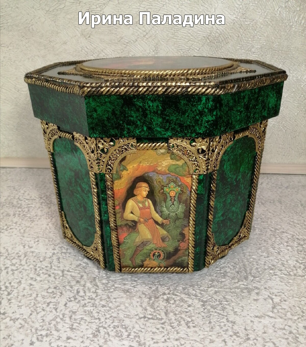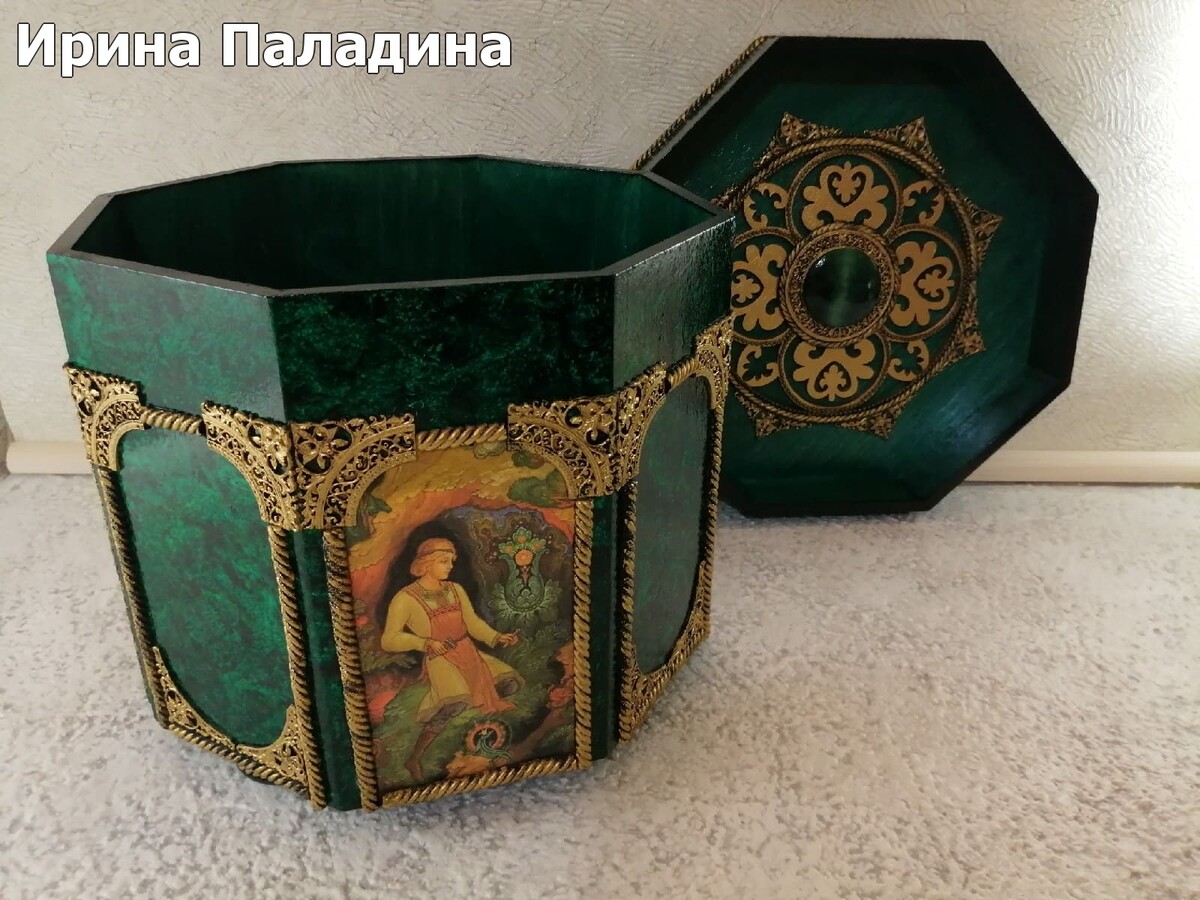Куда же мы без малахитовых драгоценных самоцветов, которые завораживают глубоким зеленым цветом и причудливыми узорами! Воссоздать эту красоту «рукотворно» просто нереально, поэтому работаем с декупажной картой.