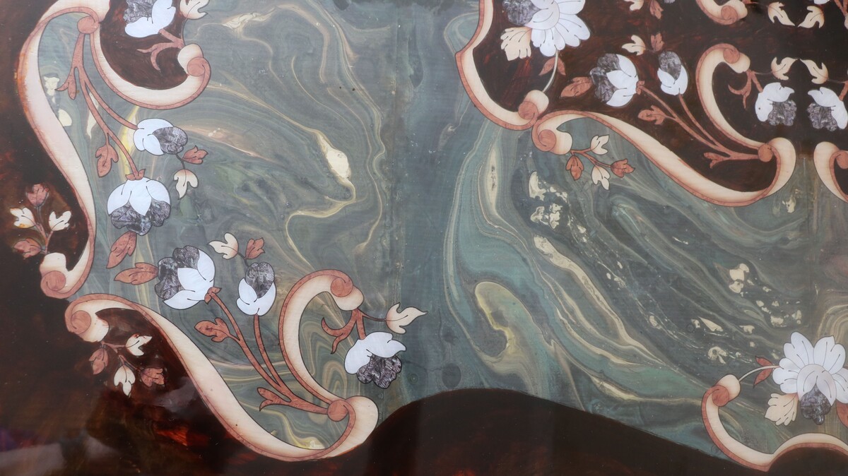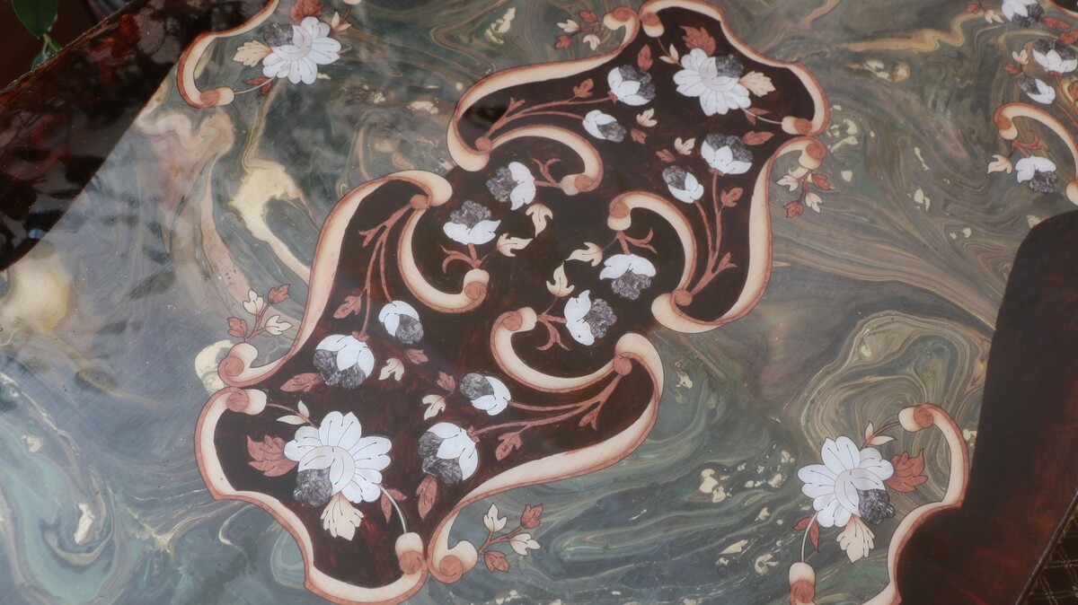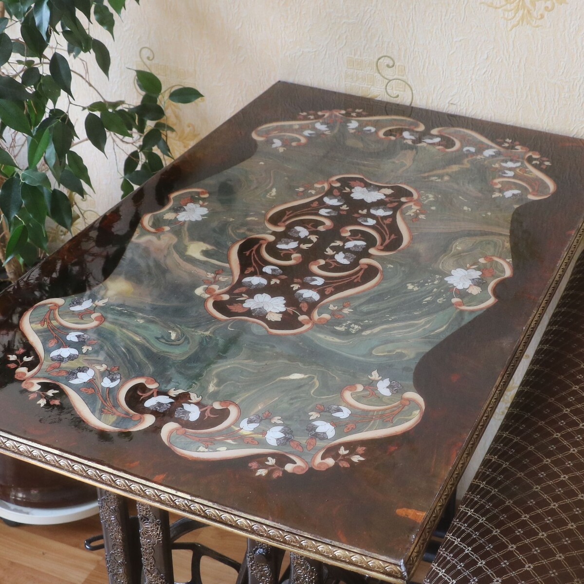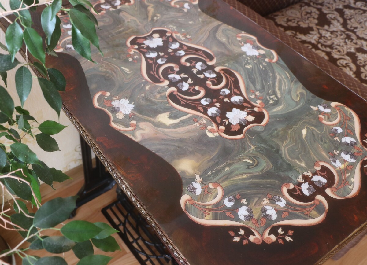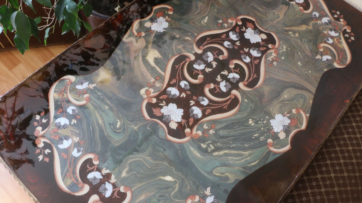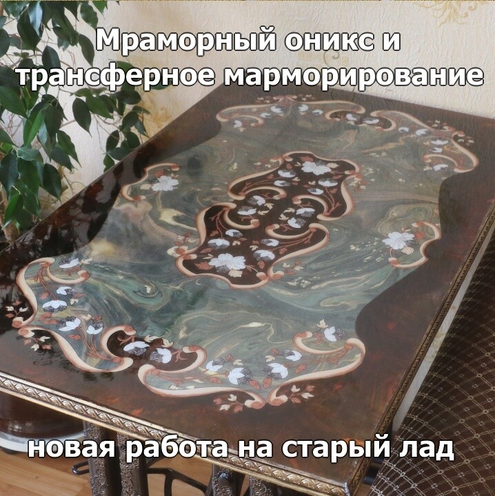- Украсим столик мебельными трансферами с имитацией интарсии и перламутра.