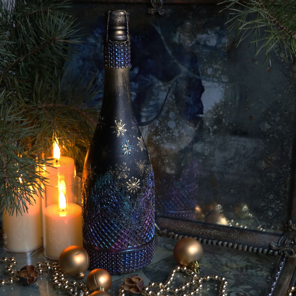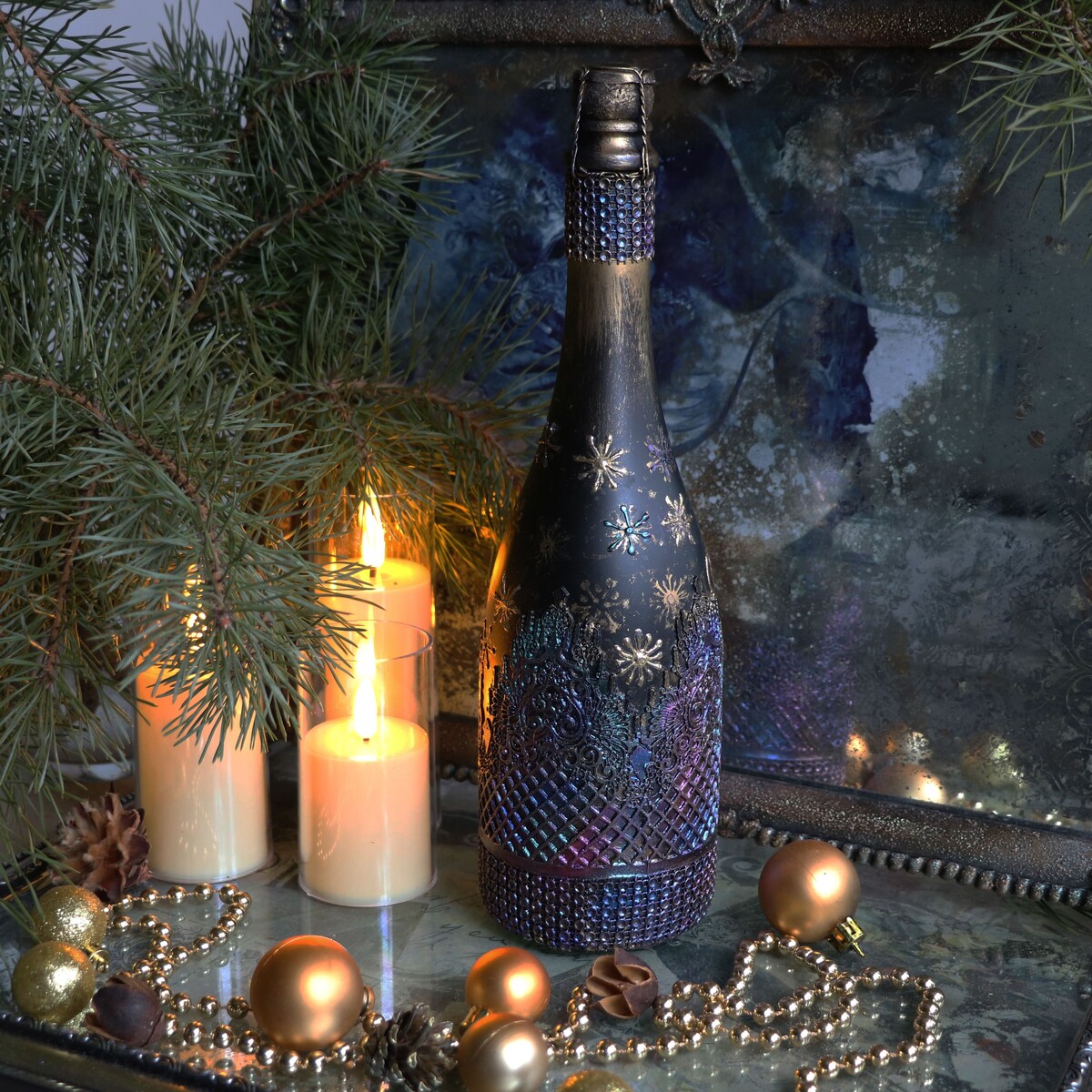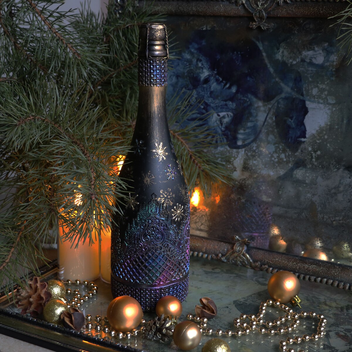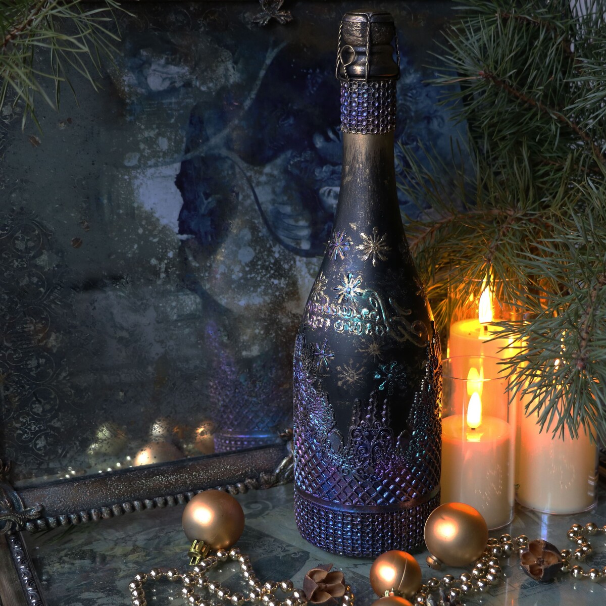 В преддверии Нового года решила задекорировать бутылочку шампанского.