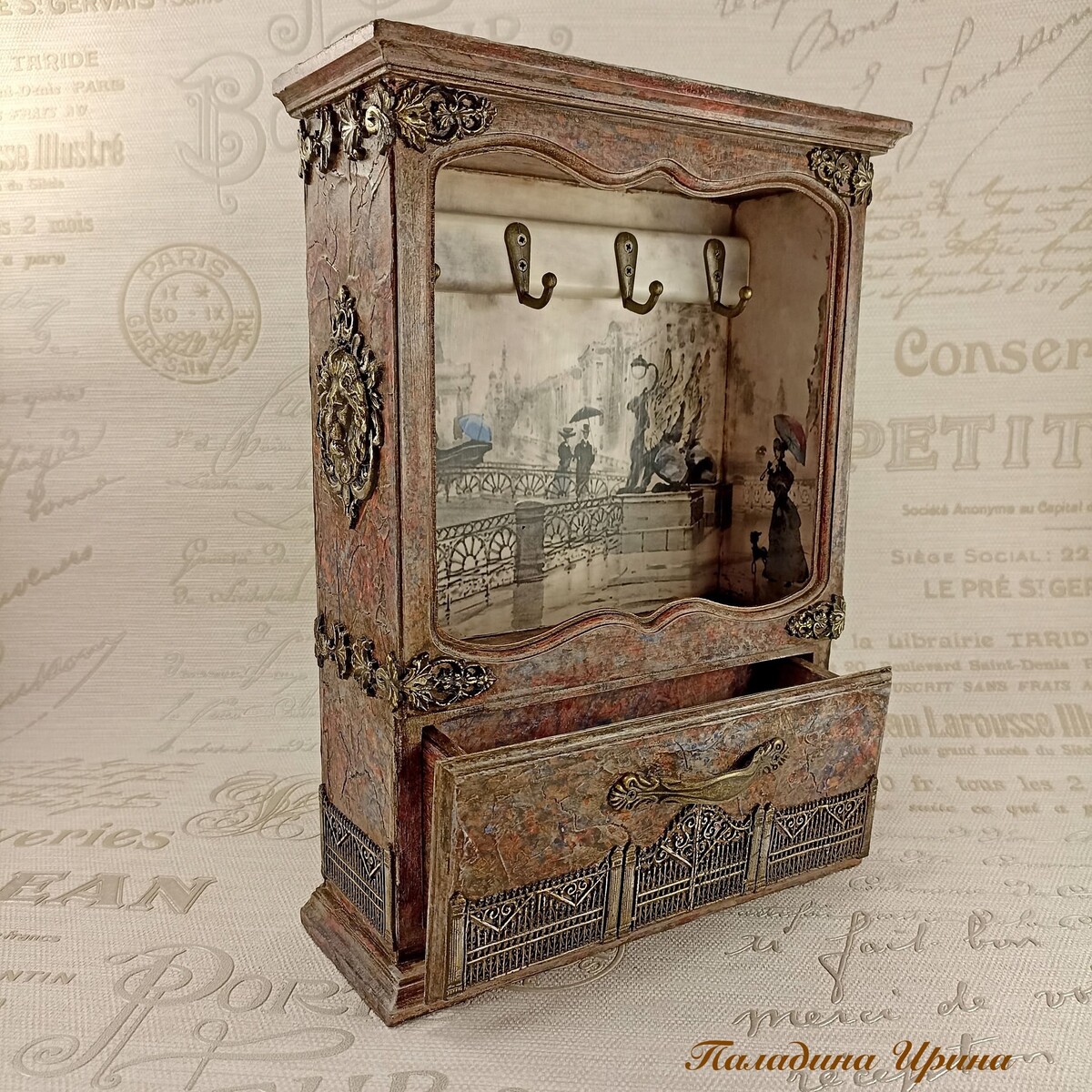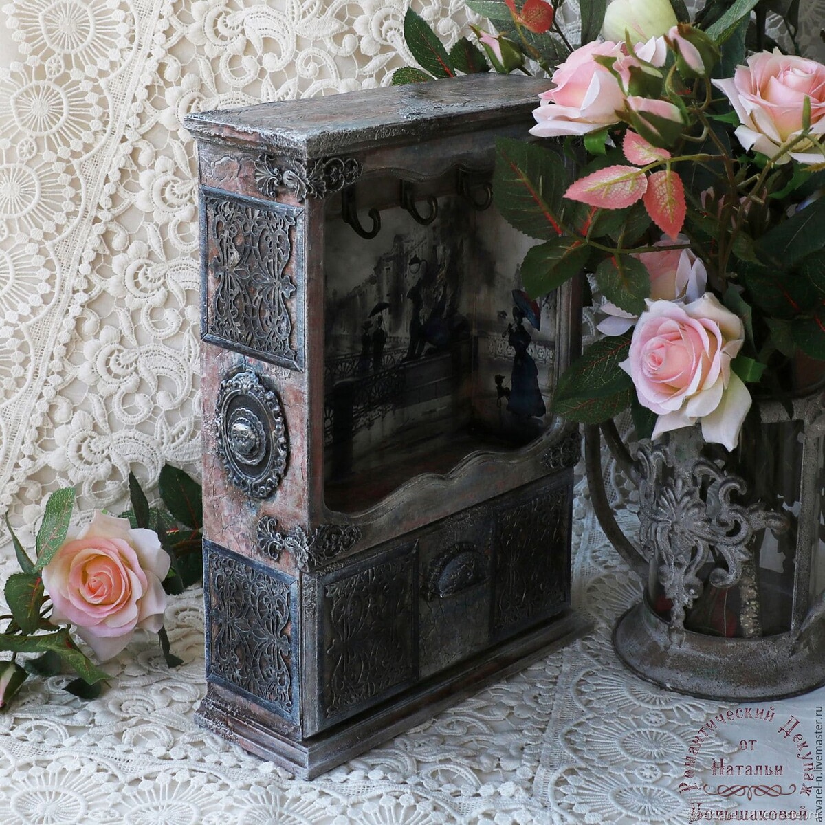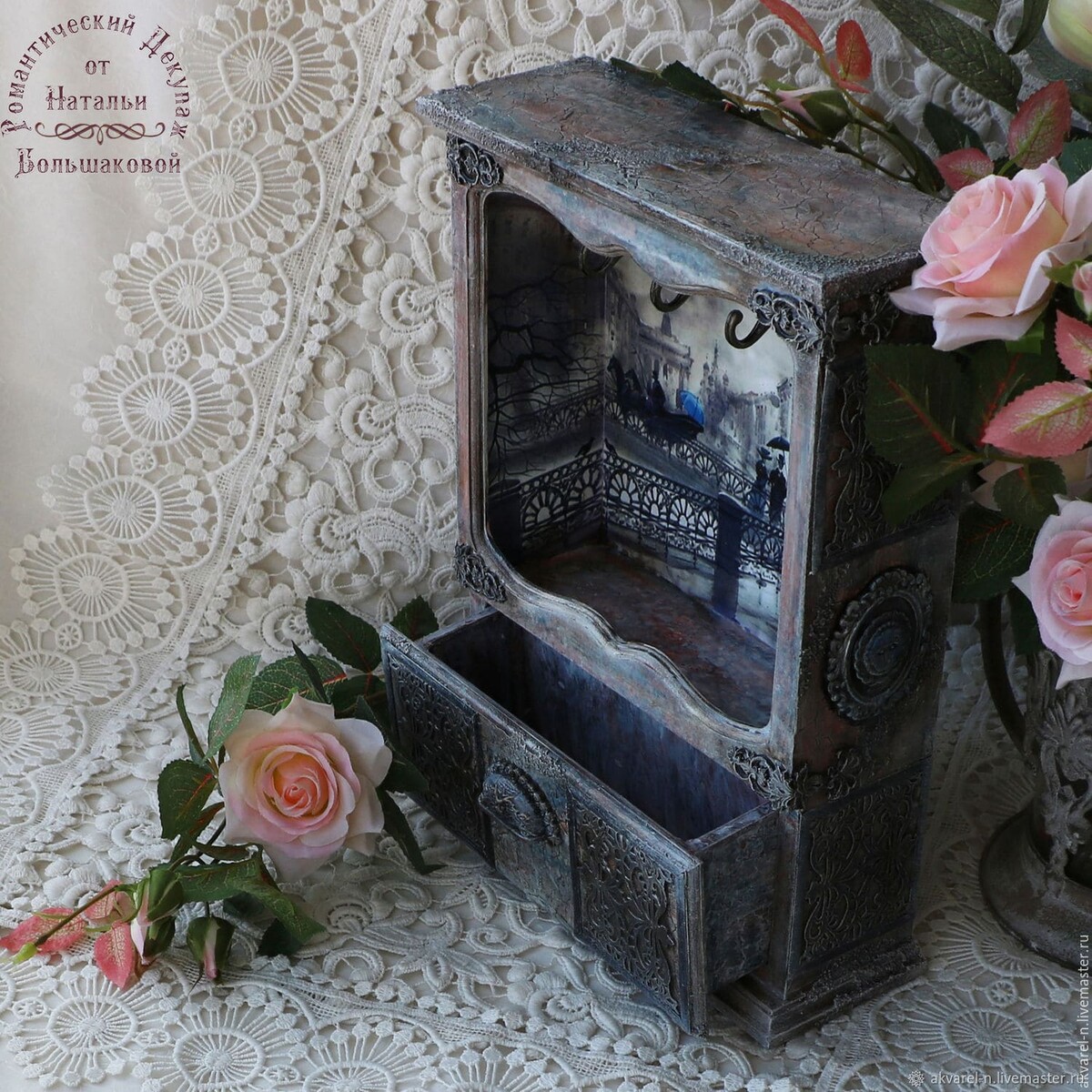 3Д кракелюрный фон с многослойным окрашиванием "а-ля мрамор". Литое кружево и объемные элементы на самодельных молдах. Патинирование и обрамление литого кружева витражной лентой.
