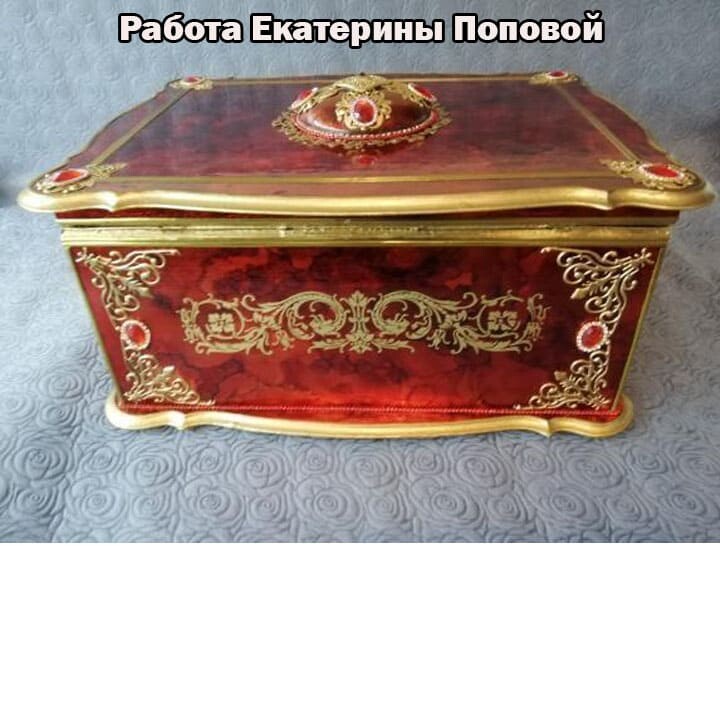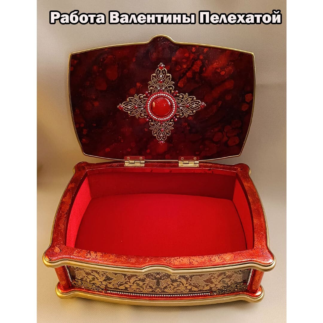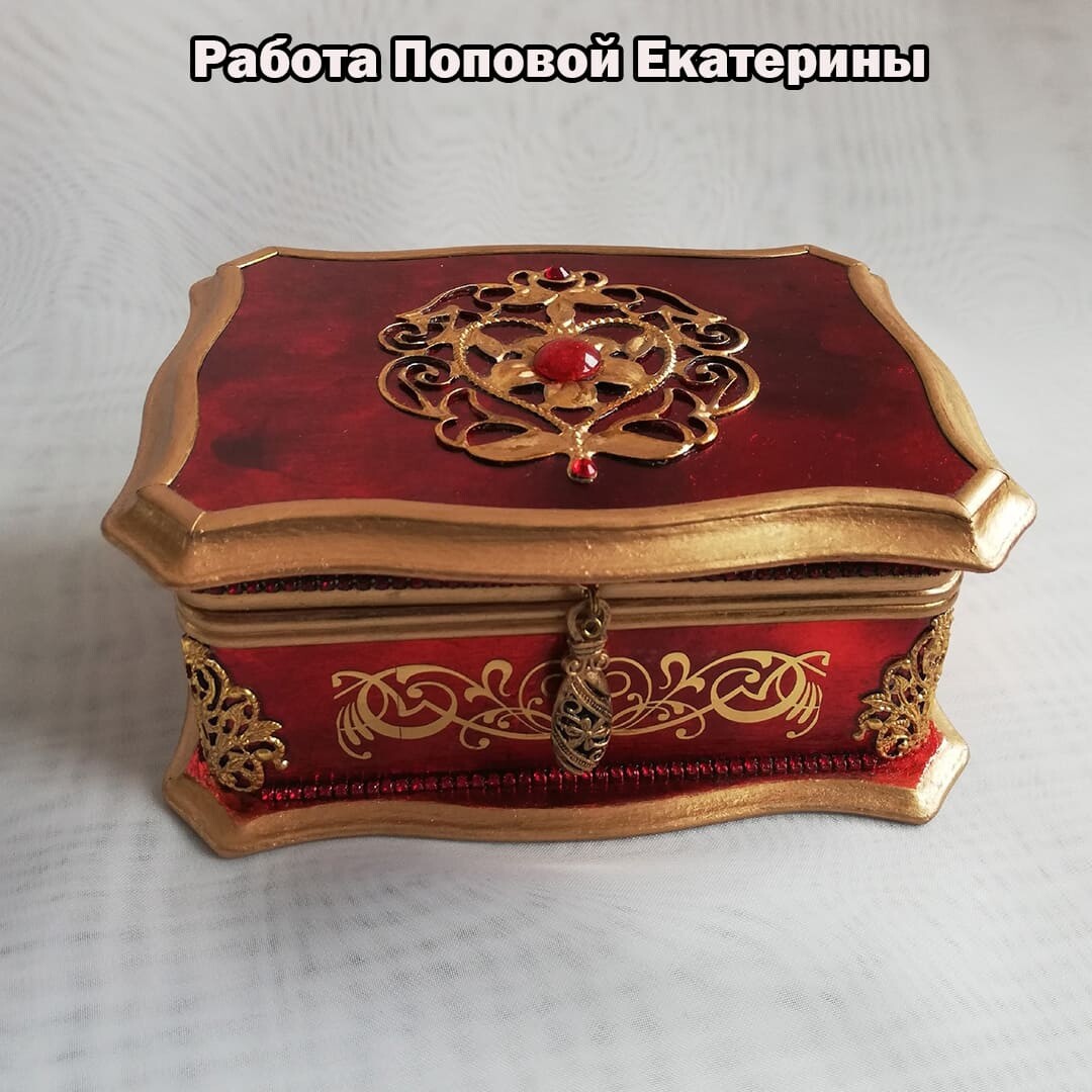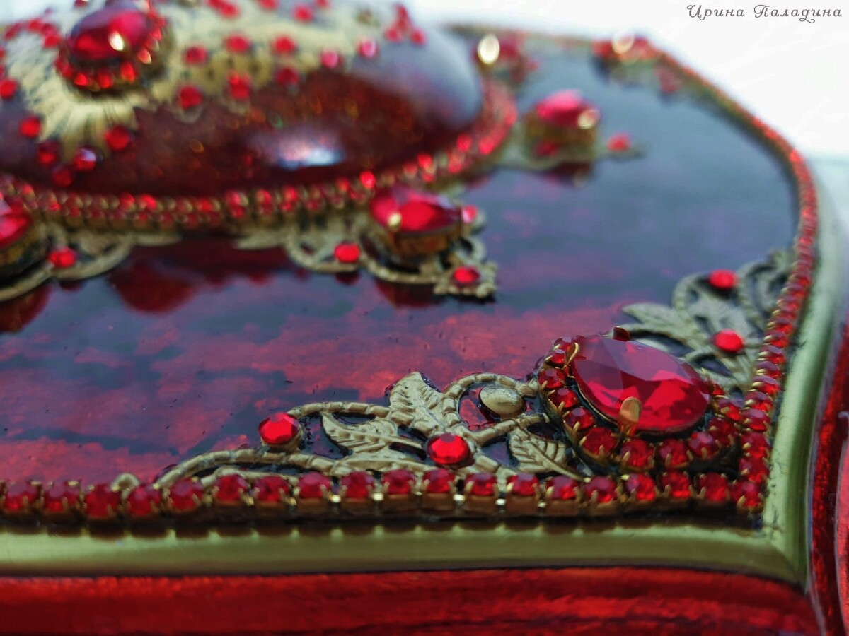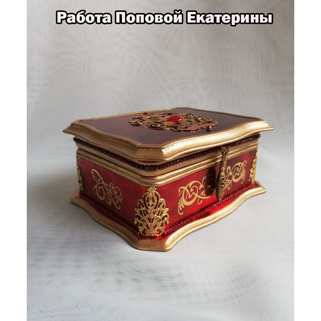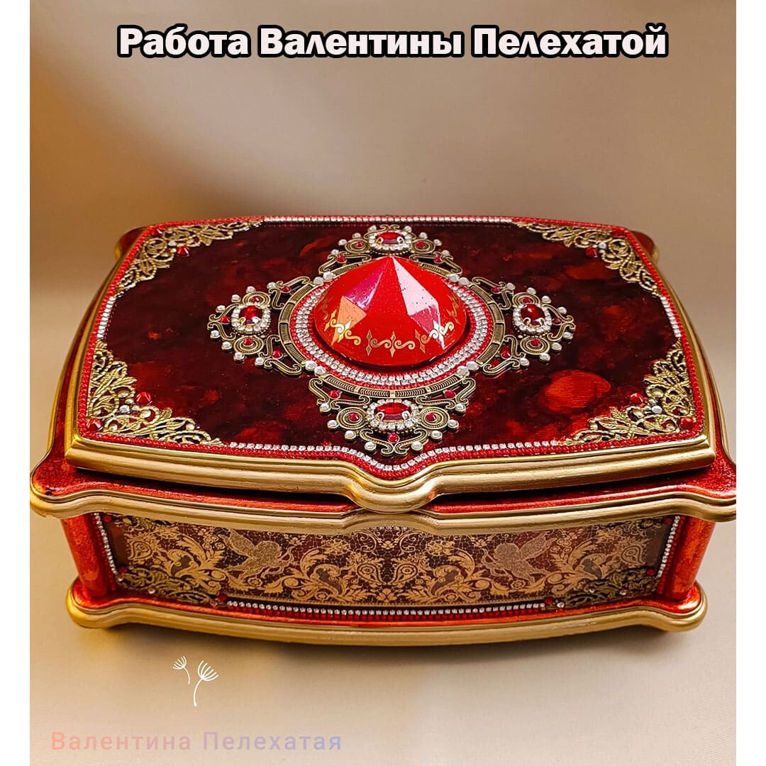 Что нужно сделать, чтобы изготовить роскошную шкатулку? Конечно красивую, изящную заготовку. И как нельзя лучше для нее подошел трансферный фон в ярких красно-бардовых тонах. Переливы оттенков, насыщенность цвета-это полностью его заслуга. Минимум лакировки в несколько раз сокращает время на эту операцию. Золочение дополняет свечение и гармонирует с золотыми трансферами. В центре работы медальон с гербом с искрящимся золотисто-алым фоном. Вокруг уложена филигрань и рубиновые стразы. По периметру шкатулки объемный рант. Благородство в деталях!
