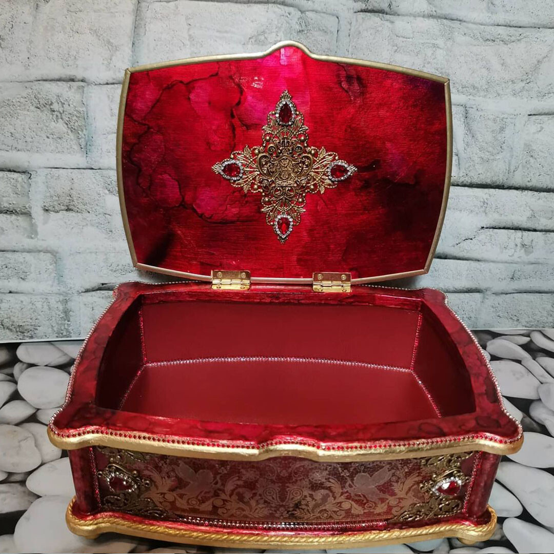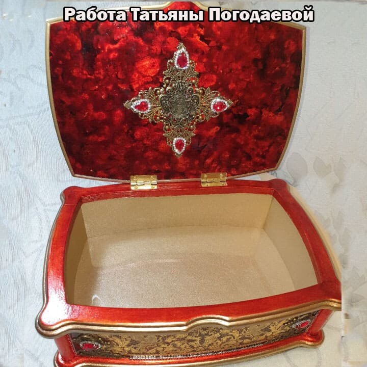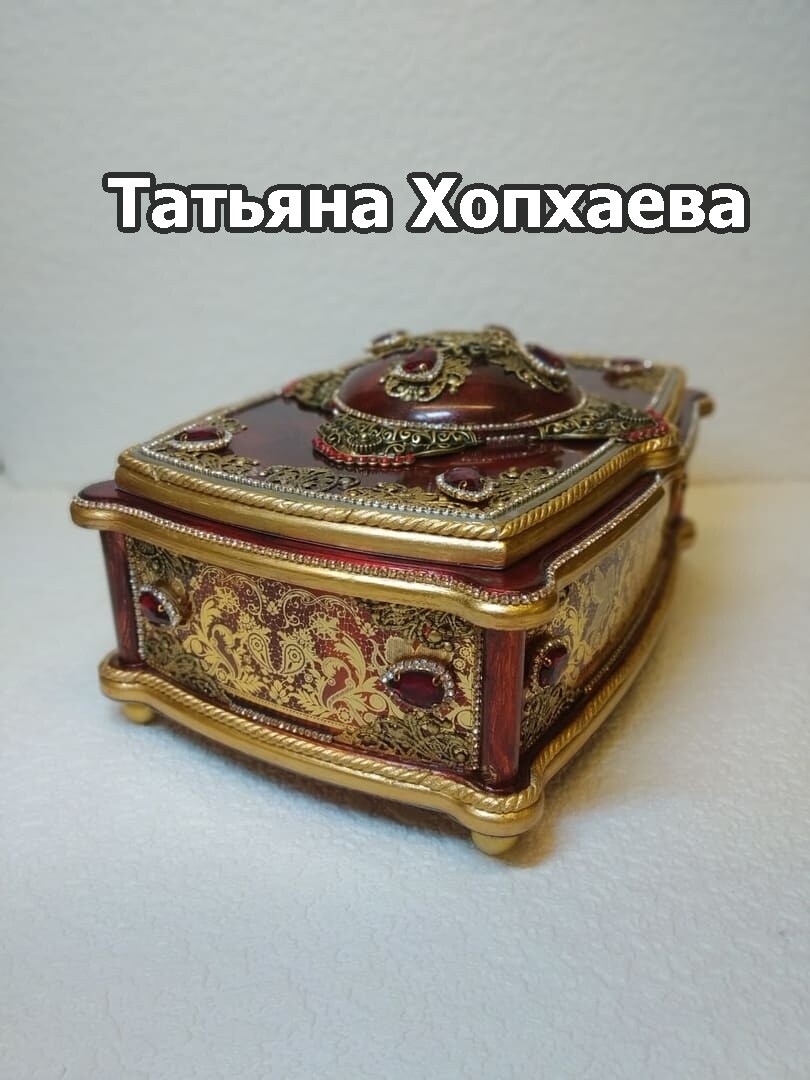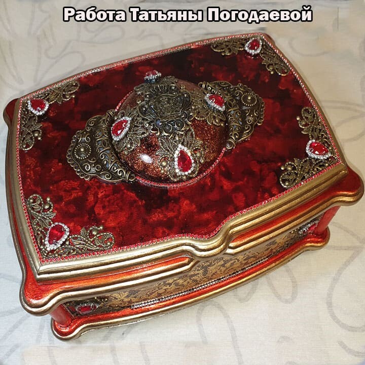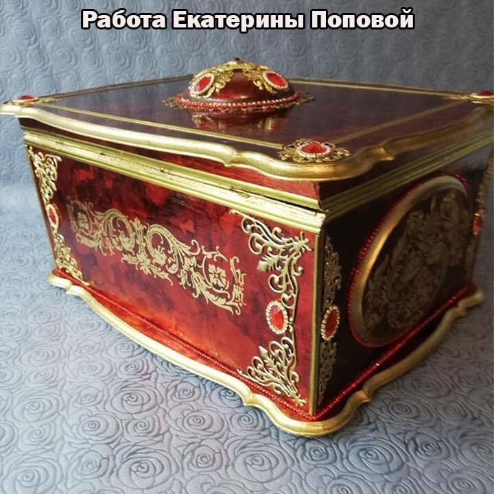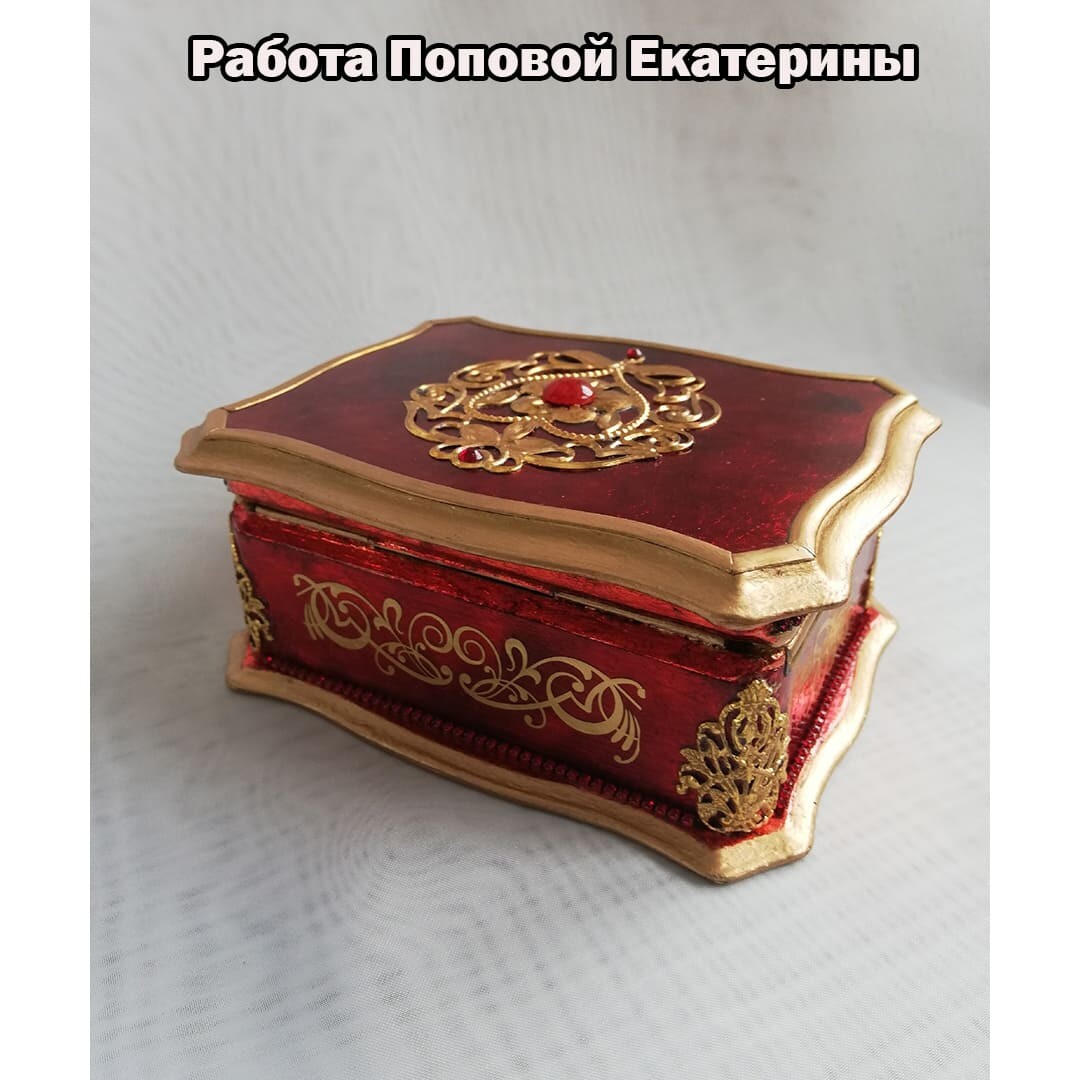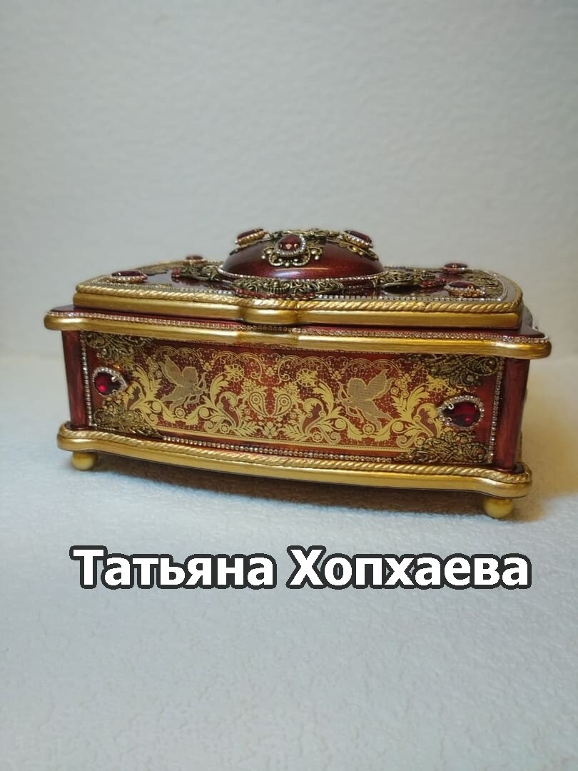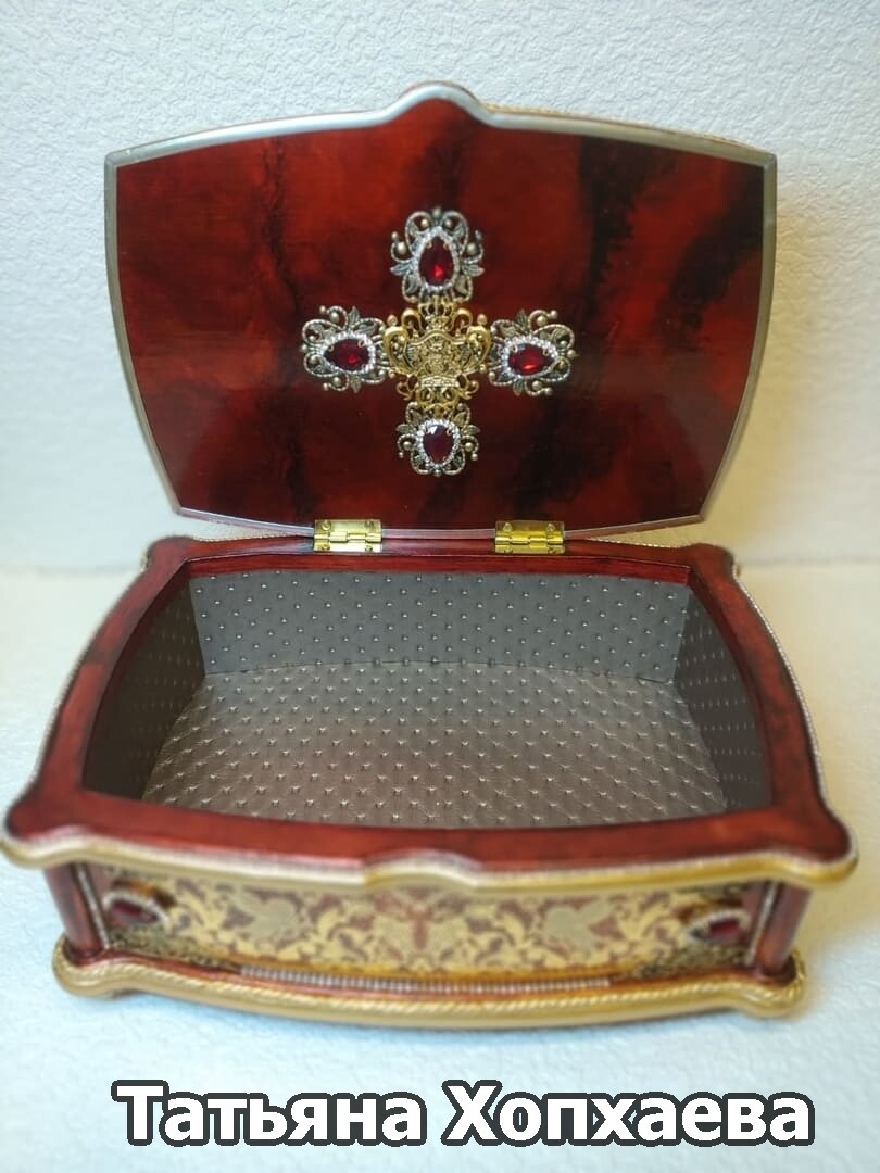 Что нужно сделать, чтобы изготовить роскошную шкатулку? Конечно красивую, изящную заготовку. И как нельзя лучше для нее подошел трансферный фон в ярких красно-бардовых тонах. Переливы оттенков, насыщенность цвета-это полностью его заслуга. Минимум лакировки в несколько раз сокращает время на эту операцию. Золочение дополняет свечение и гармонирует с золотыми трансферами. В центре работы медальон с гербом с искрящимся золотисто-алым фоном. Вокруг уложена филигрань и рубиновые стразы. По периметру шкатулки объемный рант. Благородство в деталях!