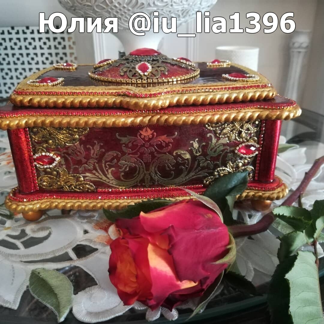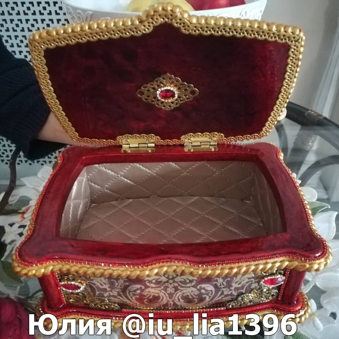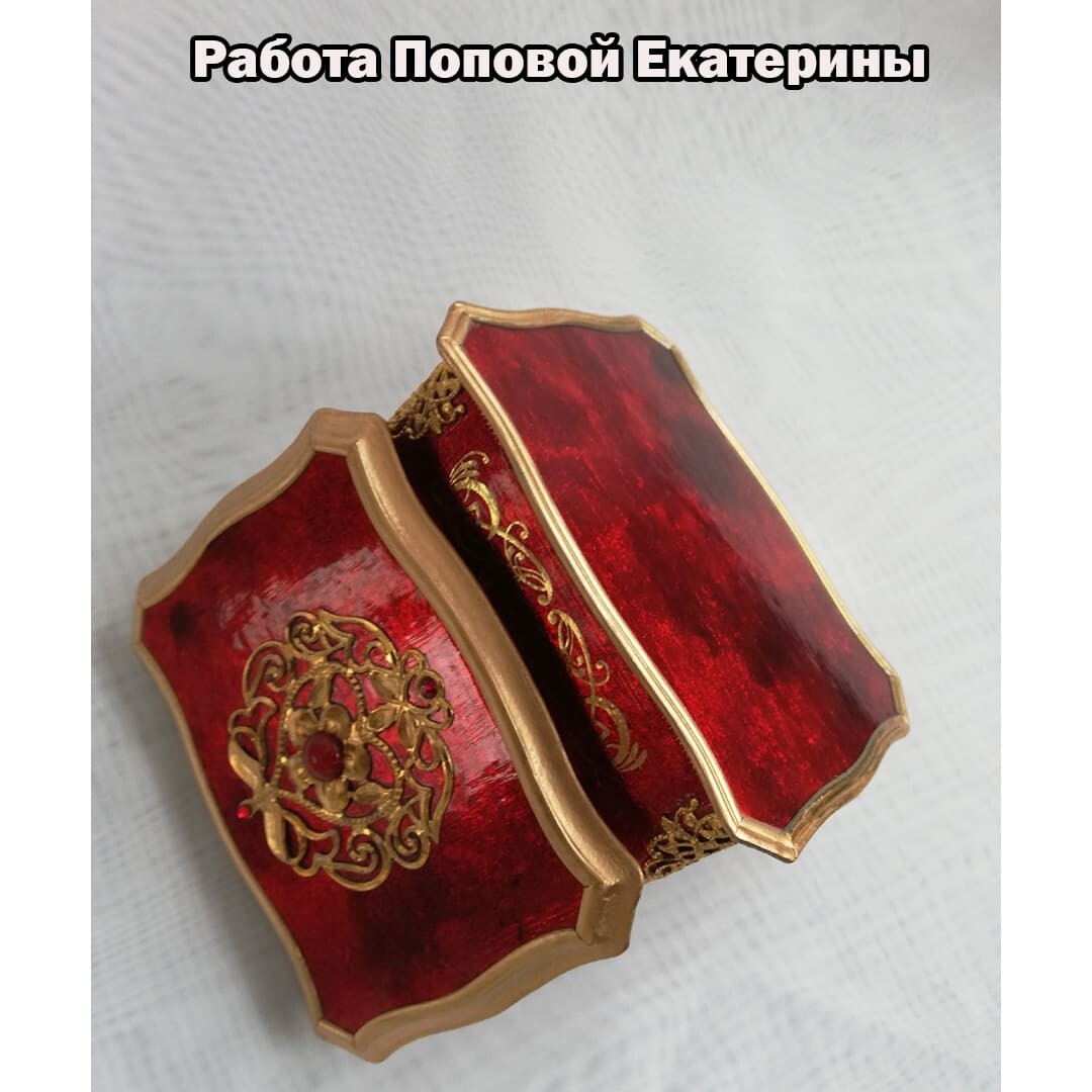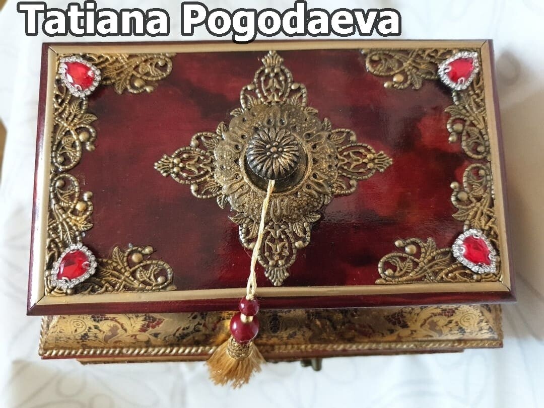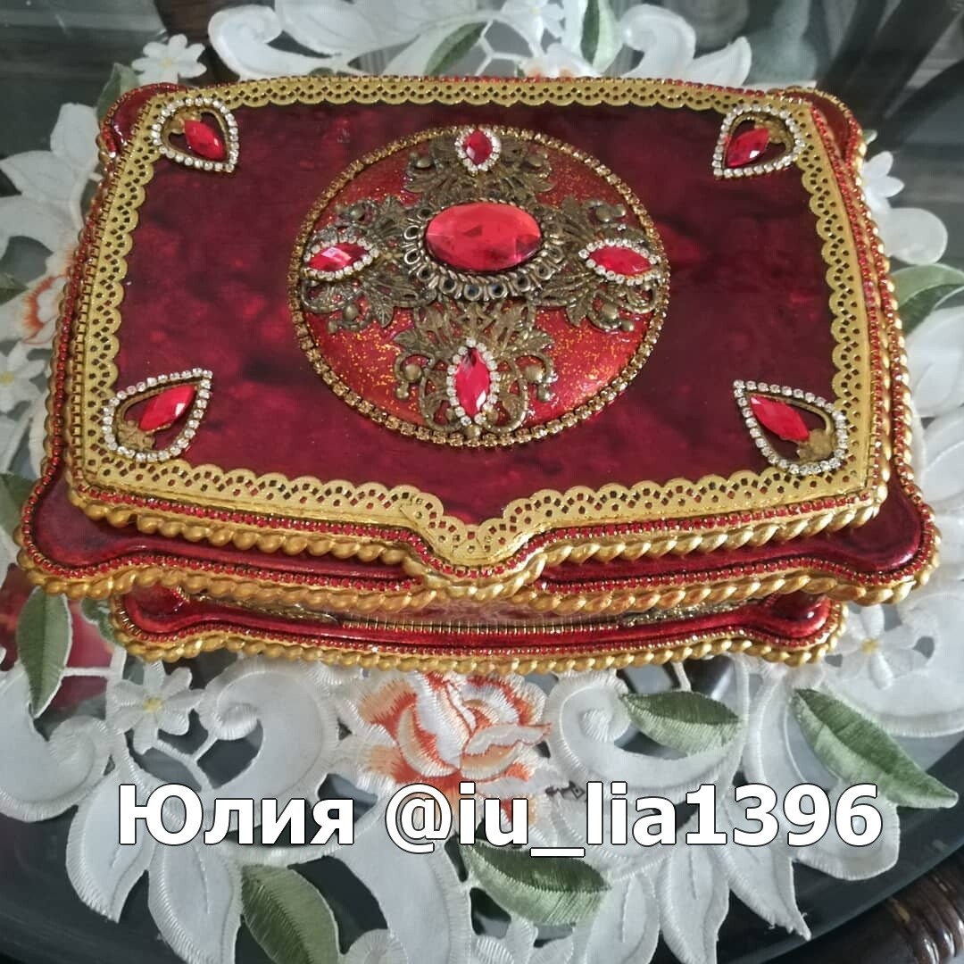 Что нужно сделать, чтобы изготовить роскошную шкатулку? Конечно красивую, изящную заготовку. И как нельзя лучше для нее подошел трансферный фон в ярких красно-бардовых тонах. Переливы оттенков, насыщенность цвета-это полностью его заслуга. Минимум лакировки в несколько раз сокращает время на эту операцию. Золочение дополняет свечение и гармонирует с золотыми трансферами. В центре работы медальон с гербом с искрящимся золотисто-алым фоном. Вокруг уложена филигрань и рубиновые стразы. По периметру шкатулки объемный рант. Благородство в деталях!