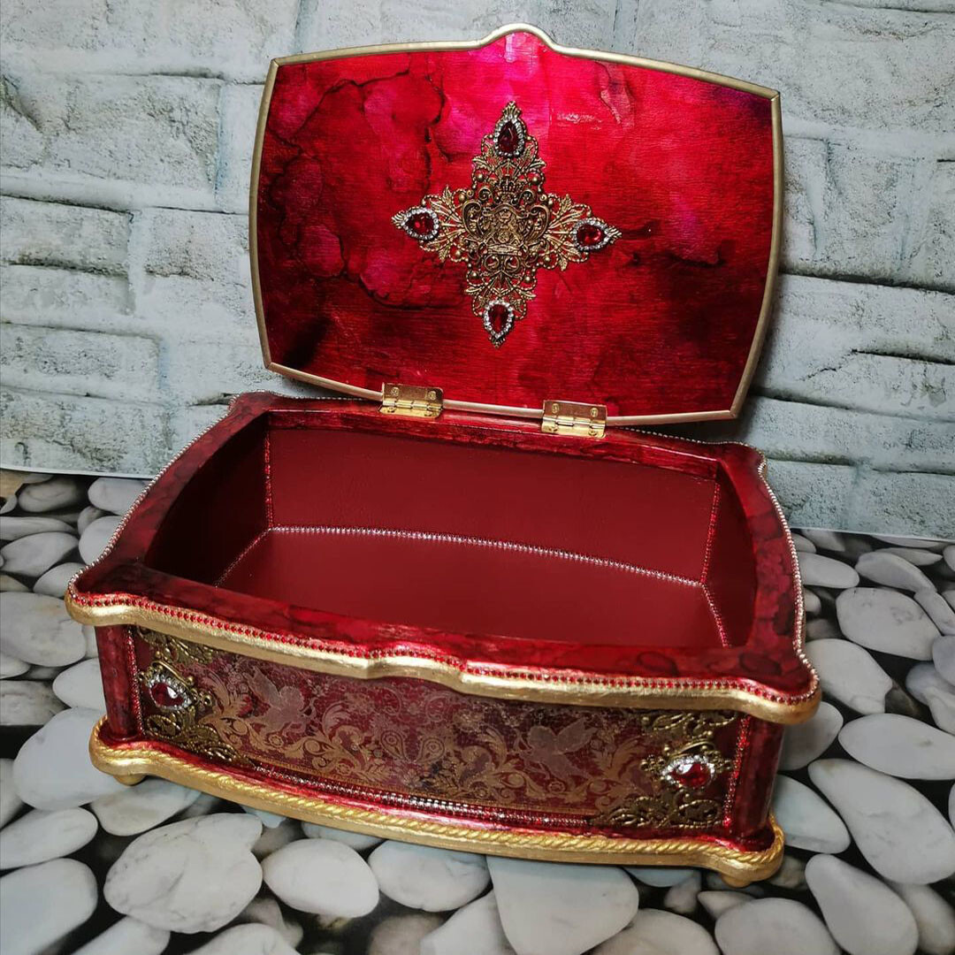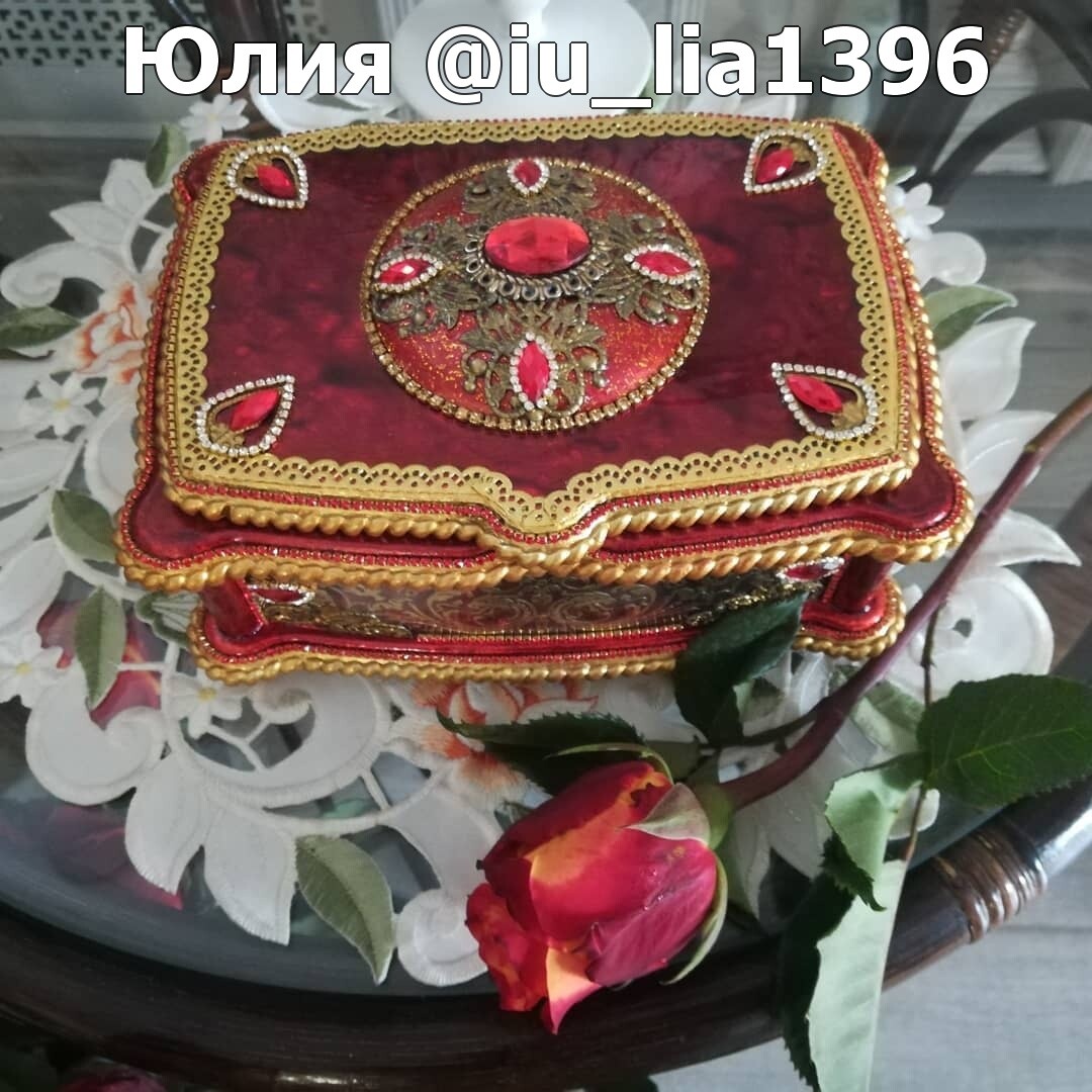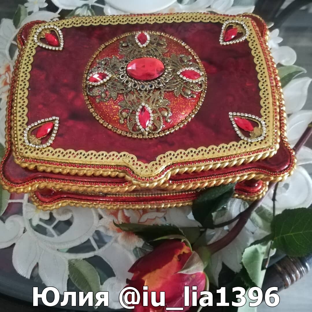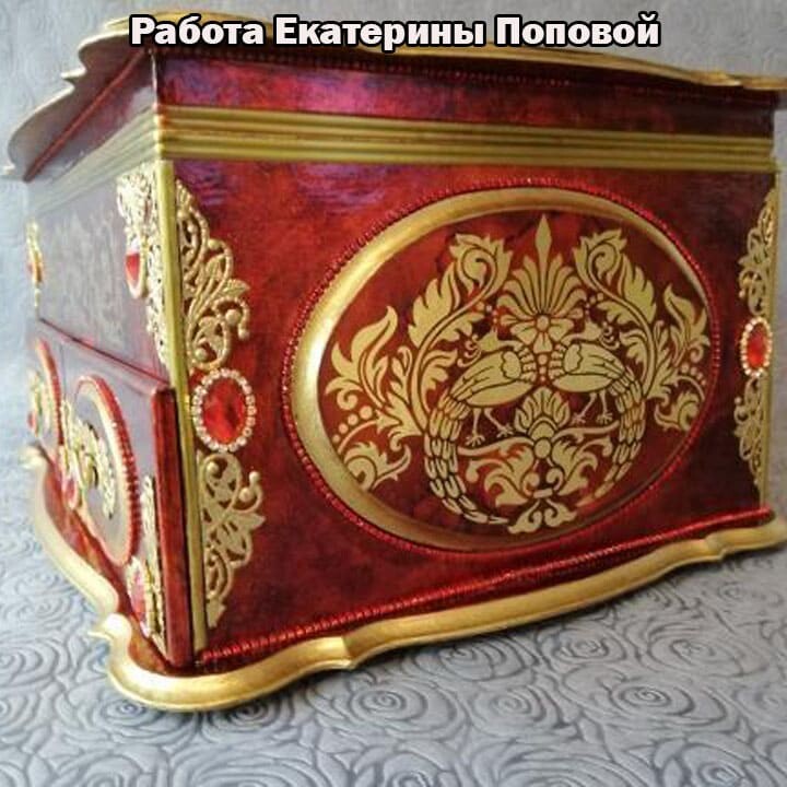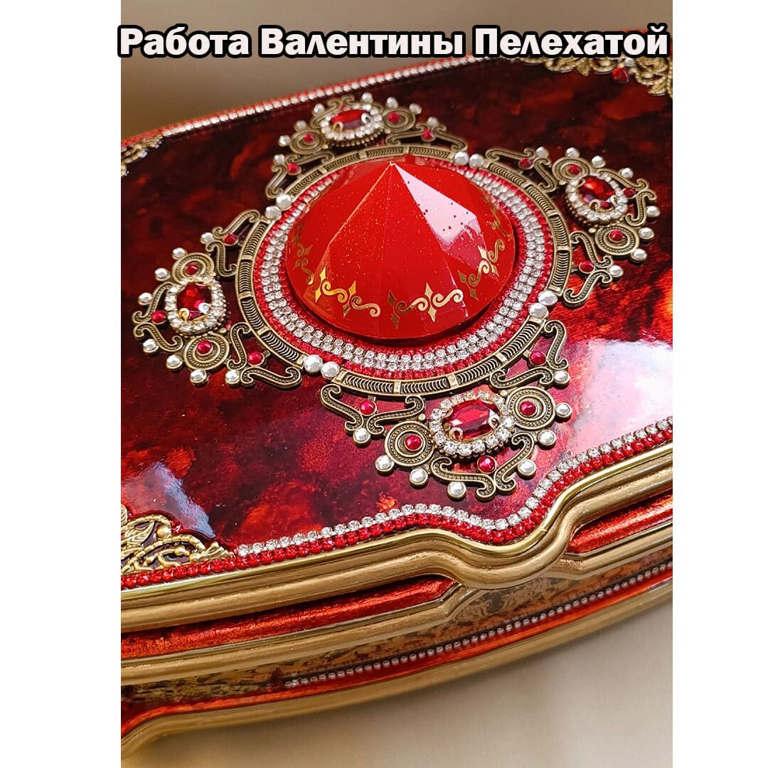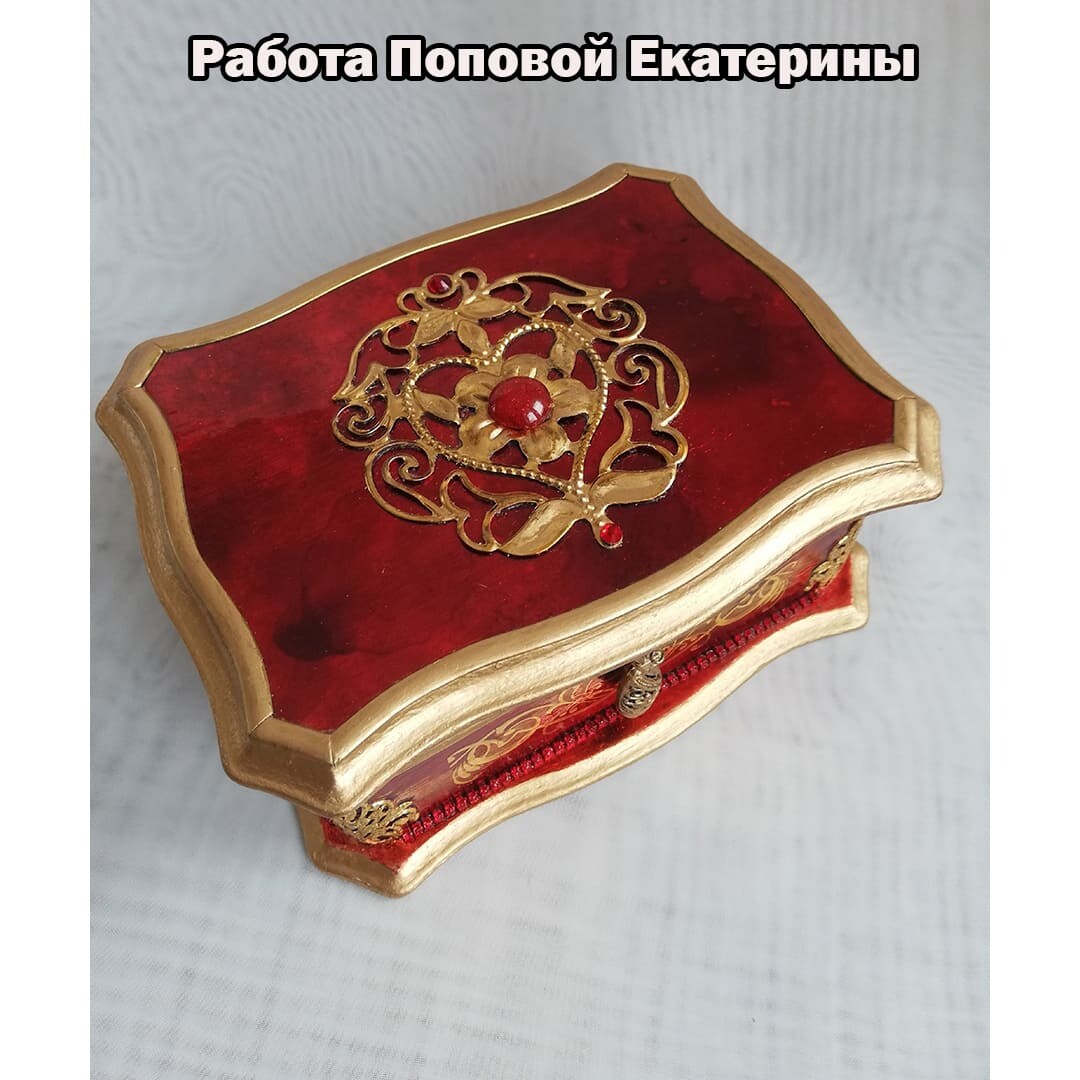 Что нужно сделать, чтобы изготовить роскошную шкатулку? Конечно красивую, изящную заготовку. И как нельзя лучше для нее подошел трансферный фон в ярких красно-бардовых тонах. Переливы оттенков, насыщенность цвета-это полностью его заслуга. Минимум лакировки в несколько раз сокращает время на эту операцию. Золочение дополняет свечение и гармонирует с золотыми трансферами. В центре работы медальон с гербом с искрящимся золотисто-алым фоном. Вокруг уложена филигрань и рубиновые стразы. По периметру шкатулки объемный рант. Благородство в деталях!