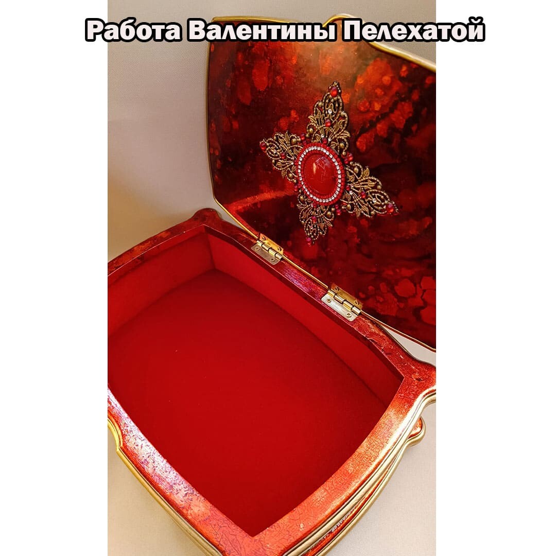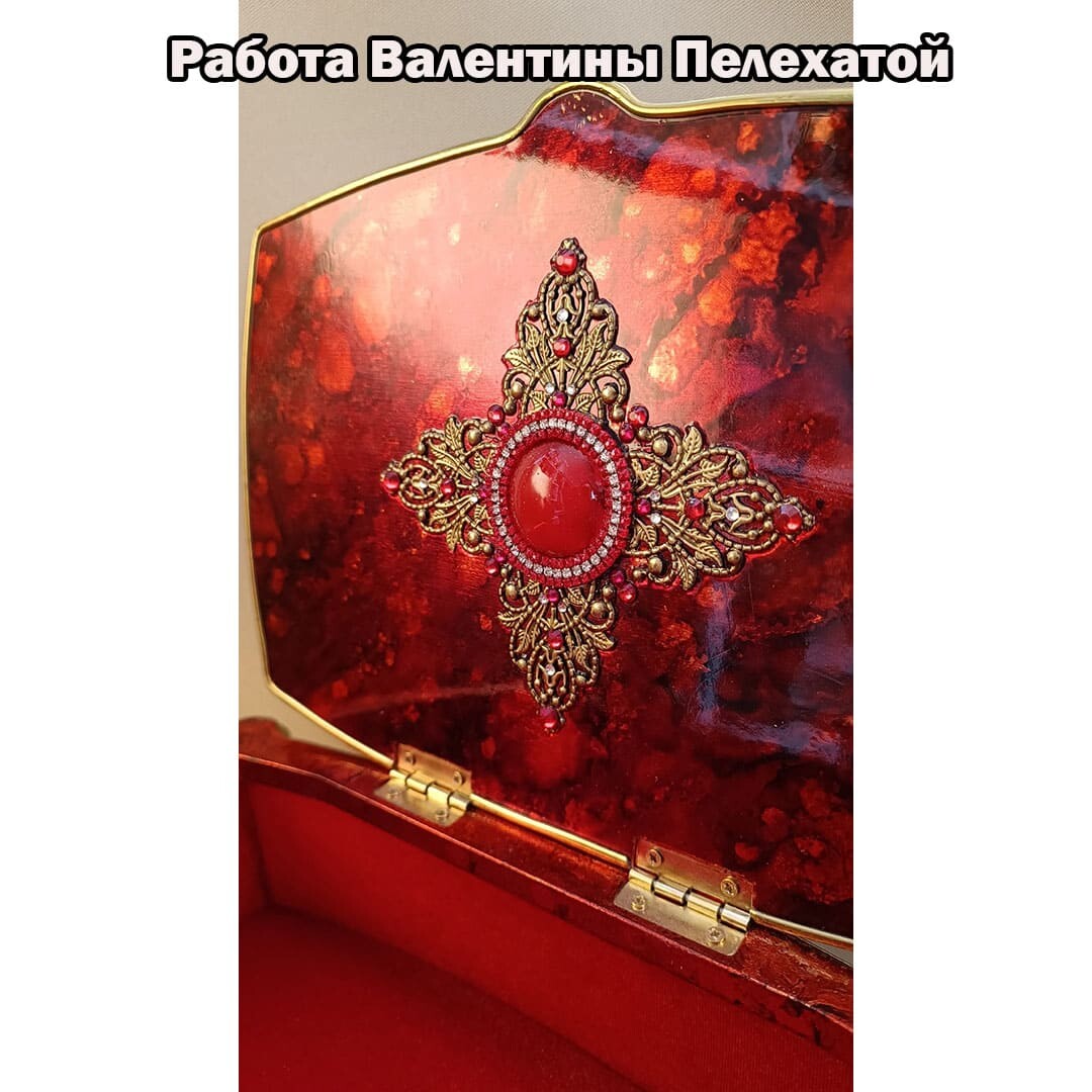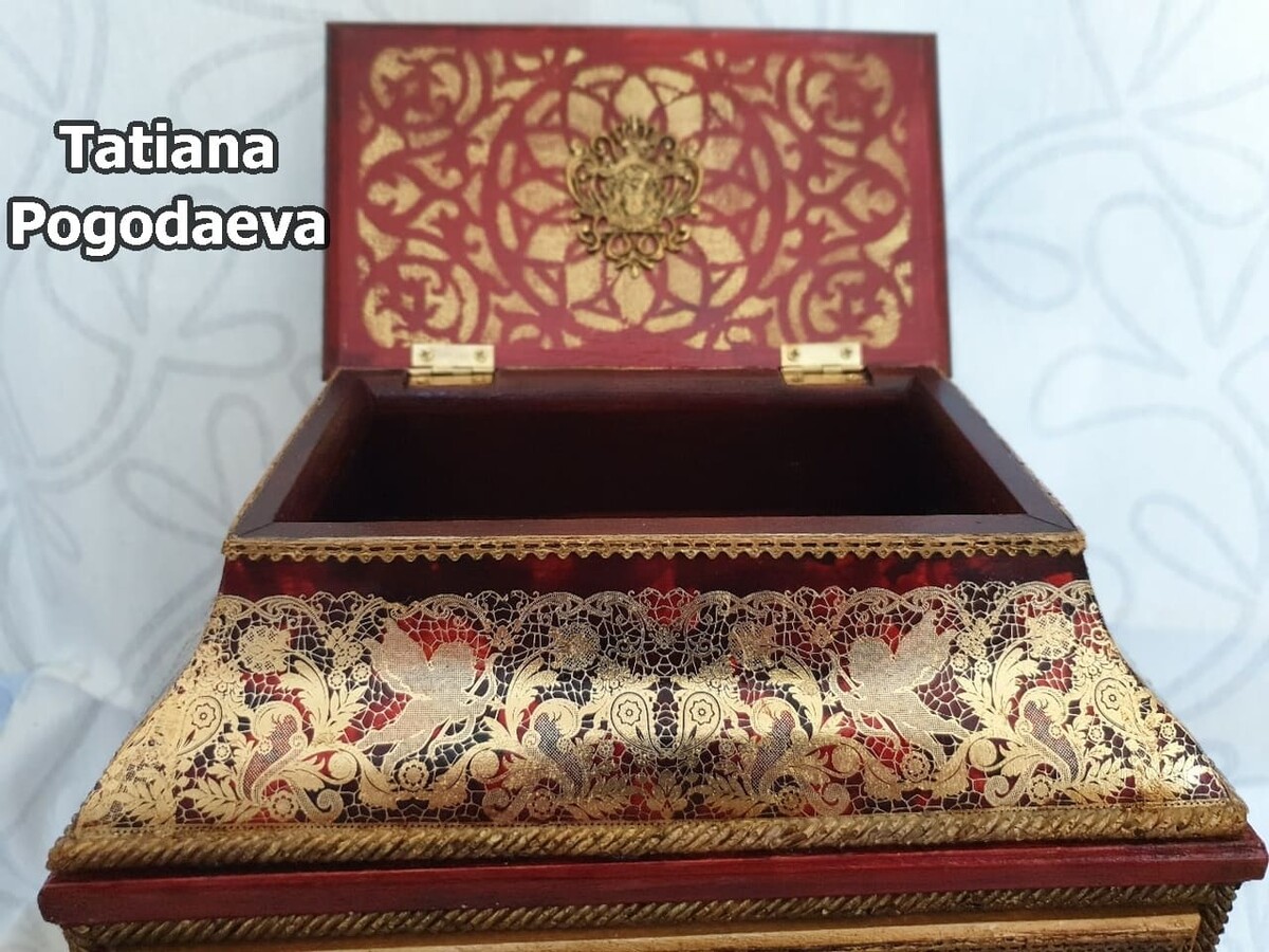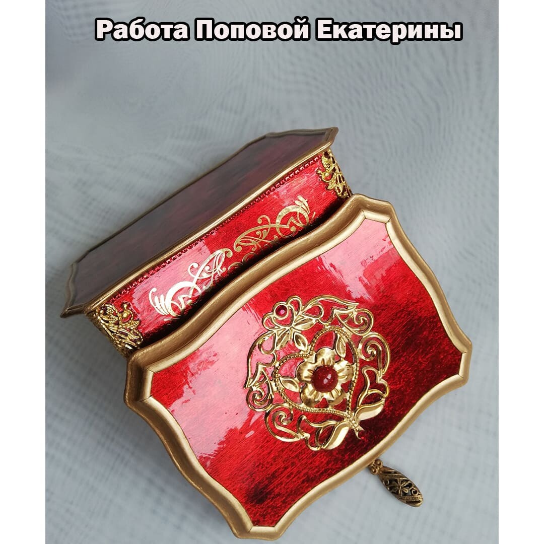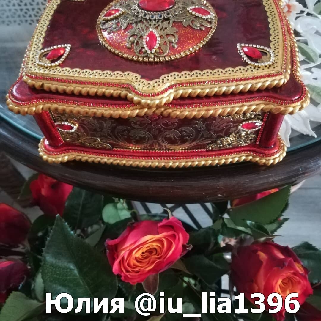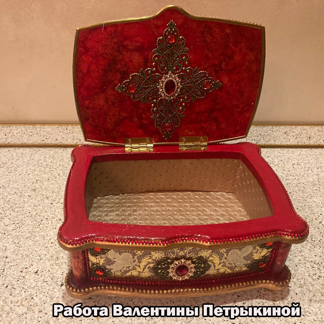 Что нужно сделать, чтобы изготовить роскошную шкатулку? Конечно красивую, изящную заготовку. И как нельзя лучше для нее подошел трансферный фон в ярких красно-бардовых тонах. Переливы оттенков, насыщенность цвета-это полностью его заслуга. Минимум лакировки в несколько раз сокращает время на эту операцию. Золочение дополняет свечение и гармонирует с золотыми трансферами. В центре работы медальон с гербом с искрящимся золотисто-алым фоном. Вокруг уложена филигрань и рубиновые стразы. По периметру шкатулки объемный рант. Благородство в деталях!