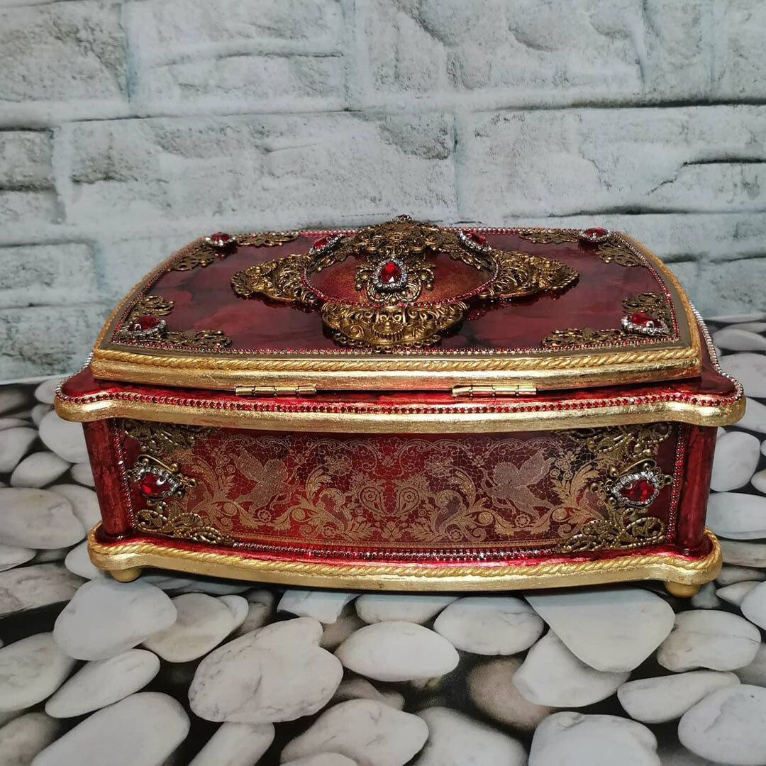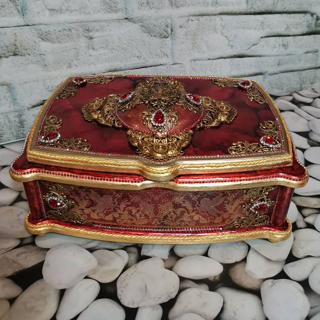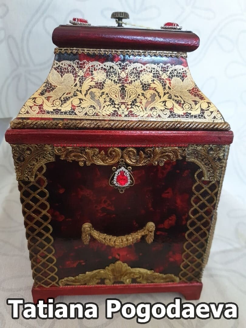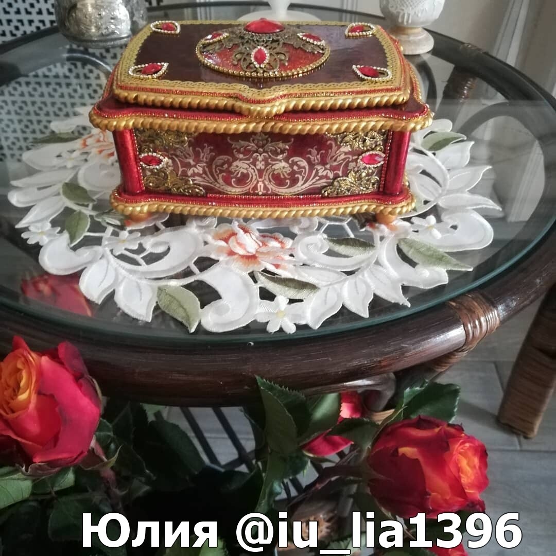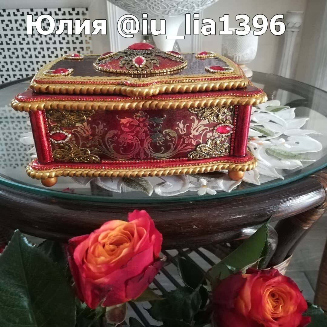 Что нужно сделать, чтобы изготовить роскошную шкатулку? Конечно красивую, изящную заготовку. И как нельзя лучше для нее подошел трансферный фон в ярких красно-бардовых тонах. Переливы оттенков, насыщенность цвета-это полностью его заслуга. Минимум лакировки в несколько раз сокращает время на эту операцию. Золочение дополняет свечение и гармонирует с золотыми трансферами. В центре работы медальон с гербом с искрящимся золотисто-алым фоном. Вокруг уложена филигрань и рубиновые стразы. По периметру шкатулки объемный рант. Благородство в деталях!