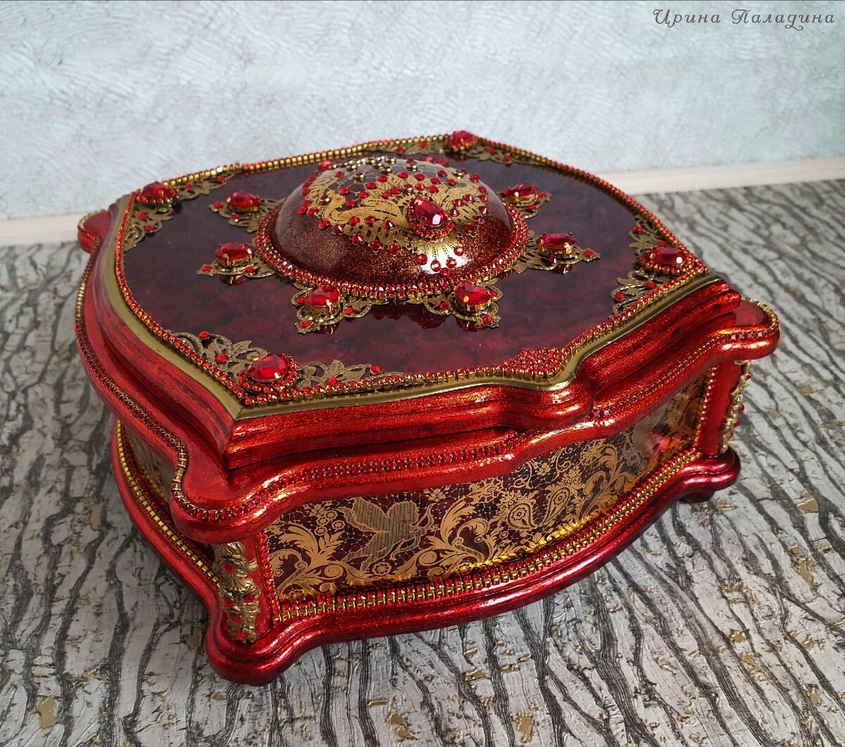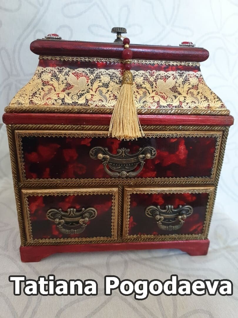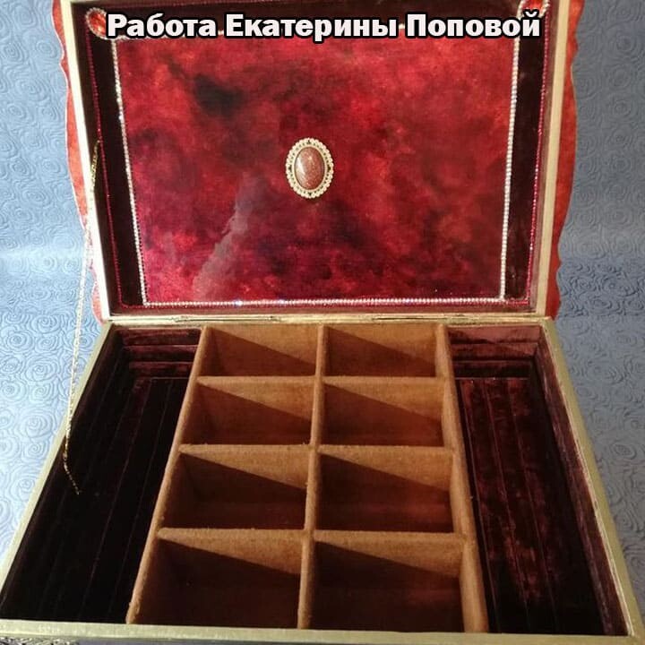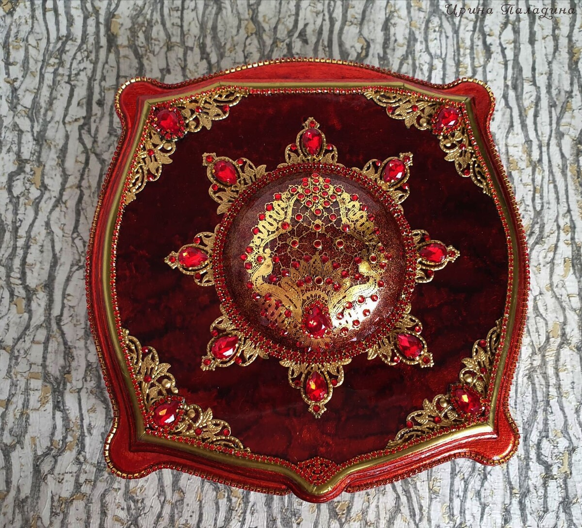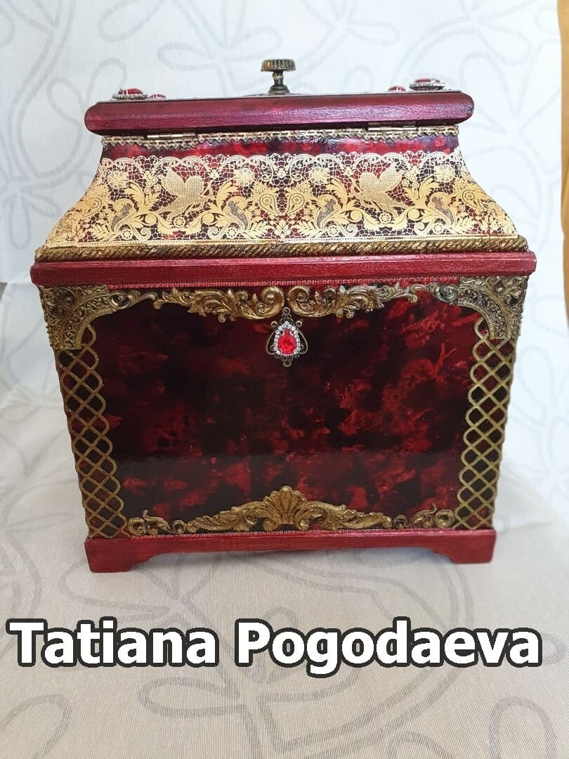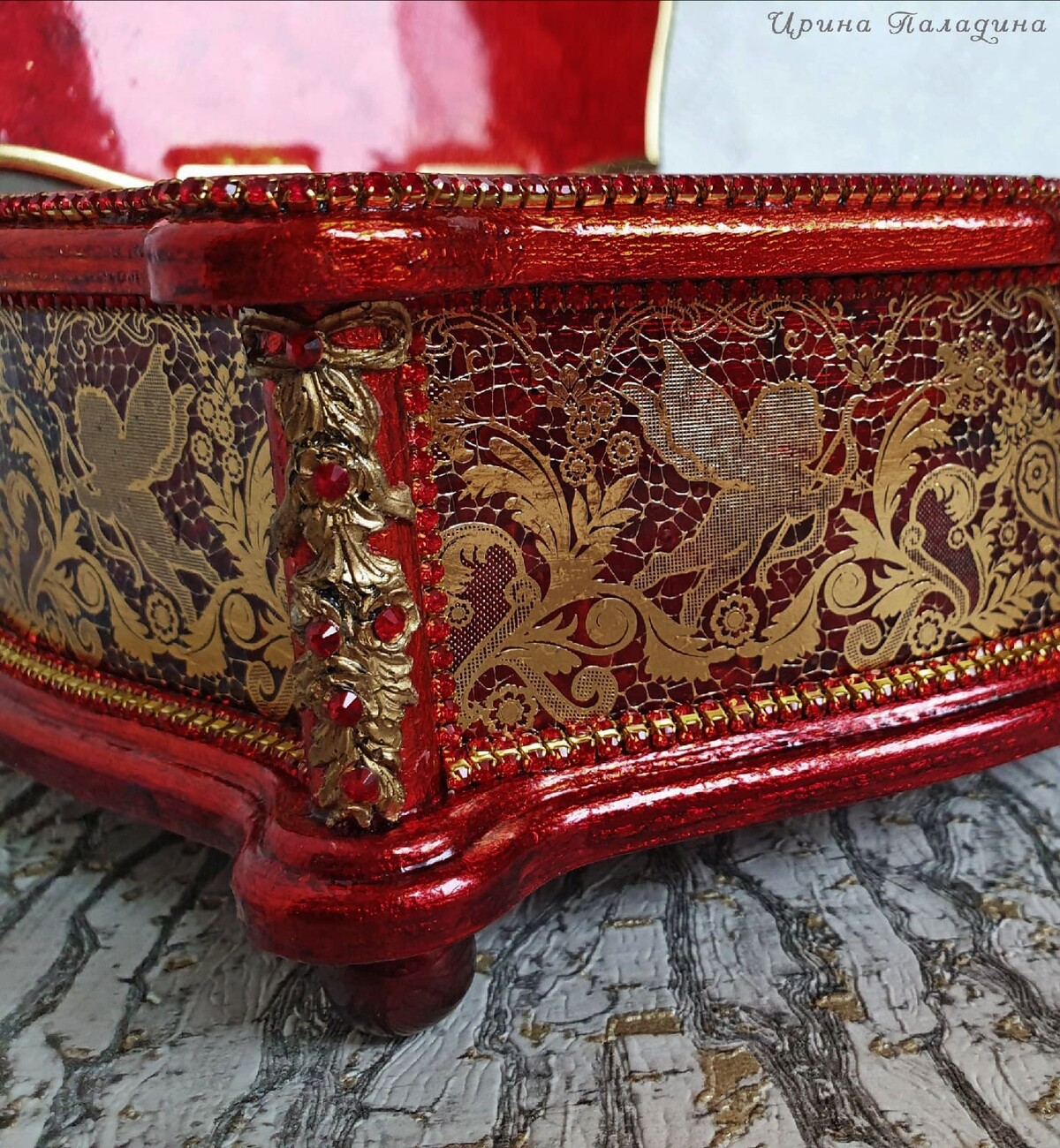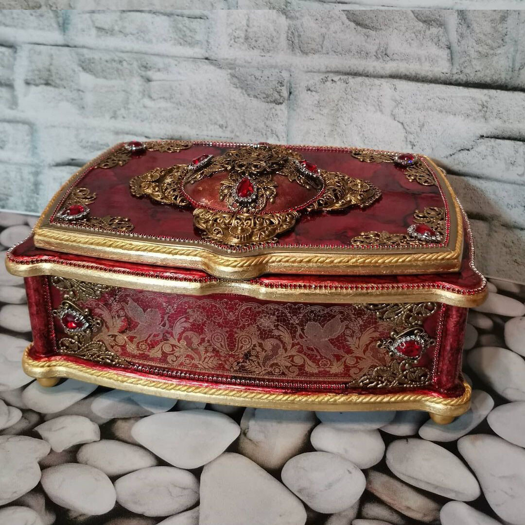 Что нужно сделать, чтобы изготовить роскошную шкатулку? Конечно красивую, изящную заготовку. И как нельзя лучше для нее подошел трансферный фон в ярких красно-бардовых тонах. Переливы оттенков, насыщенность цвета-это полностью его заслуга. Минимум лакировки в несколько раз сокращает время на эту операцию. Золочение дополняет свечение и гармонирует с золотыми трансферами. В центре работы медальон с гербом с искрящимся золотисто-алым фоном. Вокруг уложена филигрань и рубиновые стразы. По периметру шкатулки объемный рант. Благородство в деталях!