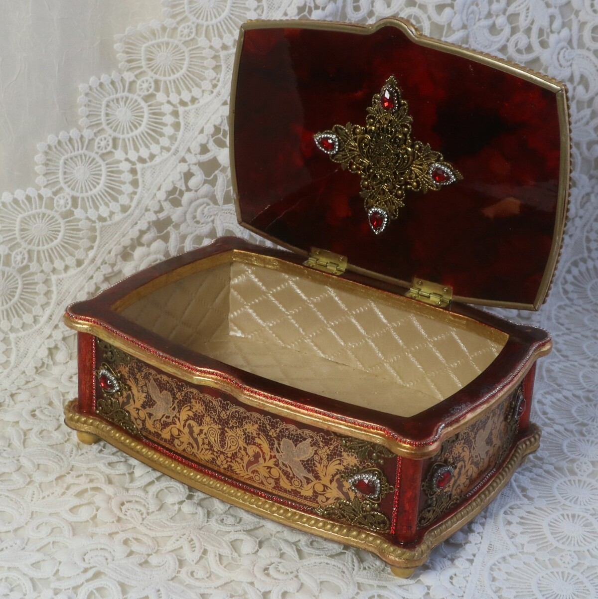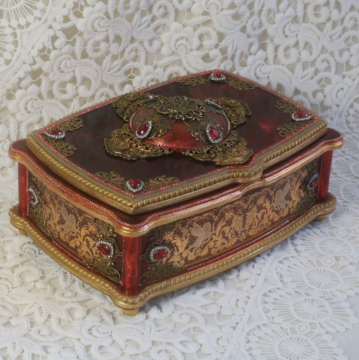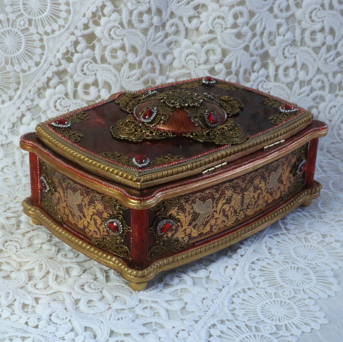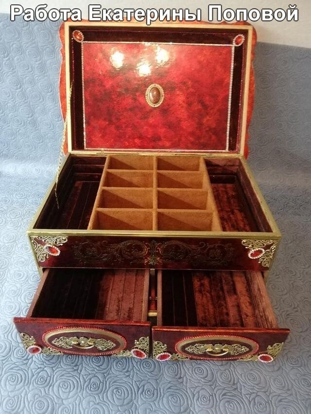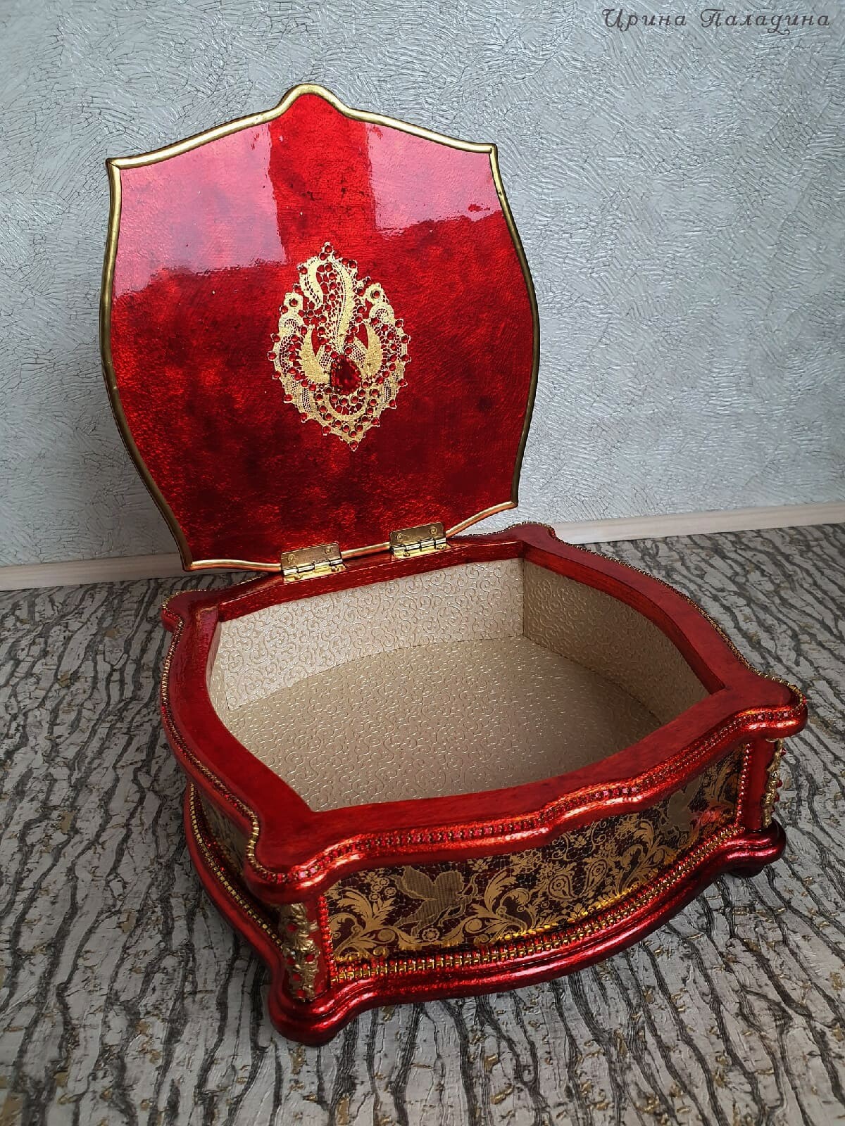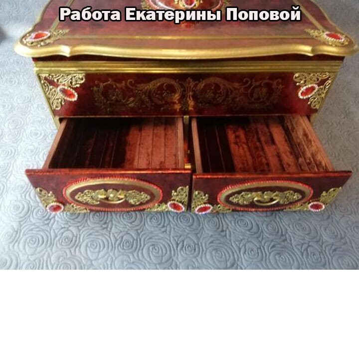 Что нужно сделать, чтобы изготовить роскошную шкатулку? Конечно красивую, изящную заготовку. И как нельзя лучше для нее подошел трансферный фон в ярких красно-бардовых тонах. Переливы оттенков, насыщенность цвета-это полностью его заслуга. Минимум лакировки в несколько раз сокращает время на эту операцию. Золочение дополняет свечение и гармонирует с золотыми трансферами. В центре работы медальон с гербом с искрящимся золотисто-алым фоном. Вокруг уложена филигрань и рубиновые стразы. По периметру шкатулки объемный рант. Благородство в деталях!