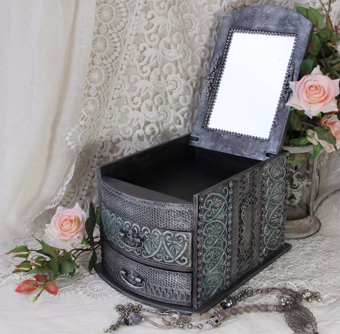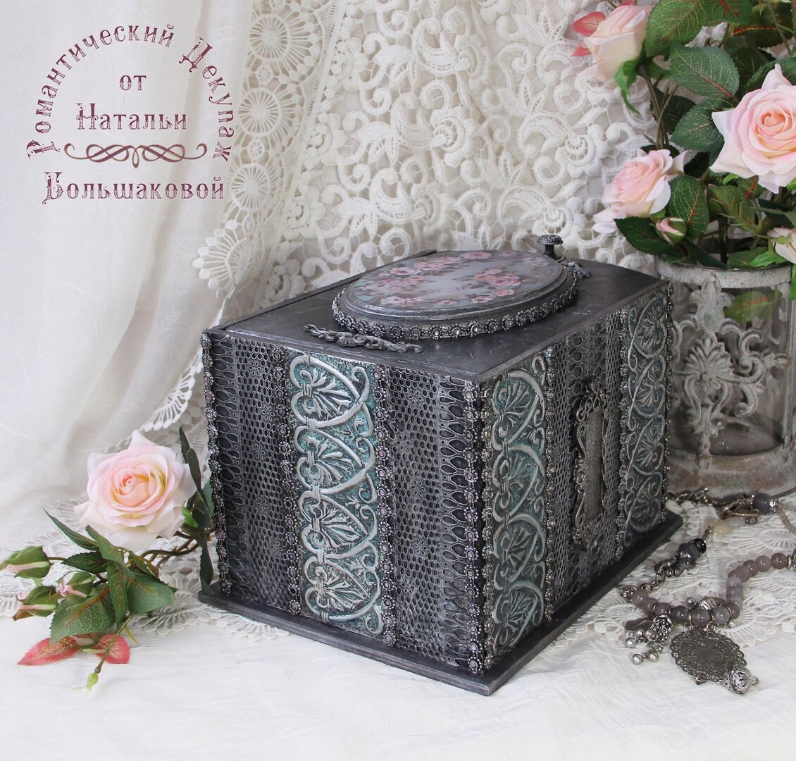 Миникомод в классическом стиле подойдет для хранения женских украшений, косметики, всяких мелочей, швейных принадлежностей и уж точно такая вещичка станет стильным украшением интерьера в вашем доме. Снаружи комодик оформлен литым кружевом и имитированной чеканкой. Объемные элементы дополняют и облагораживают декор. Внутри комодика мореная древесина и лаковое покрытия.