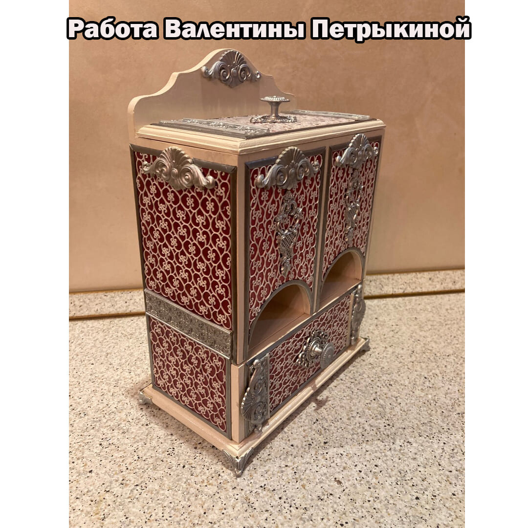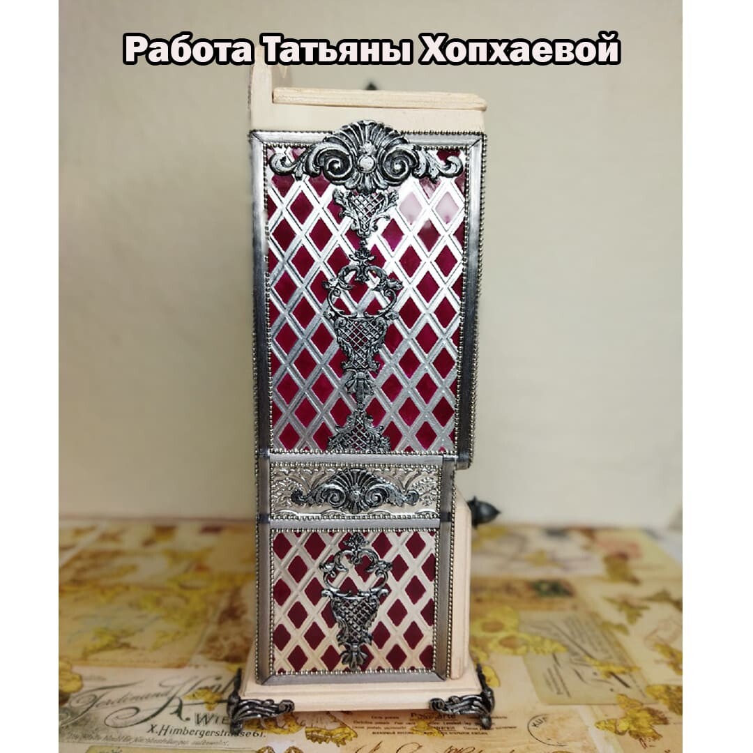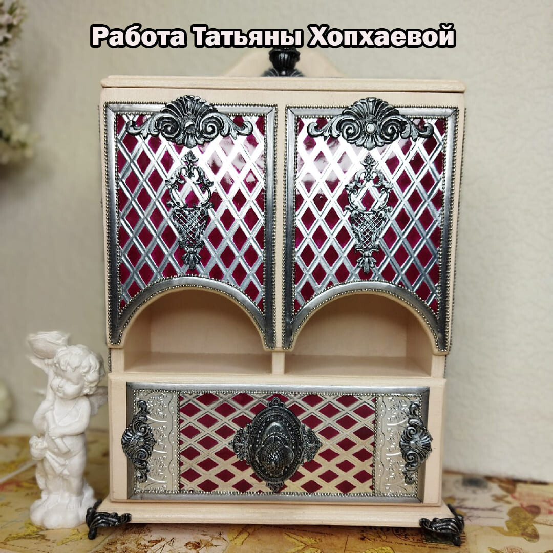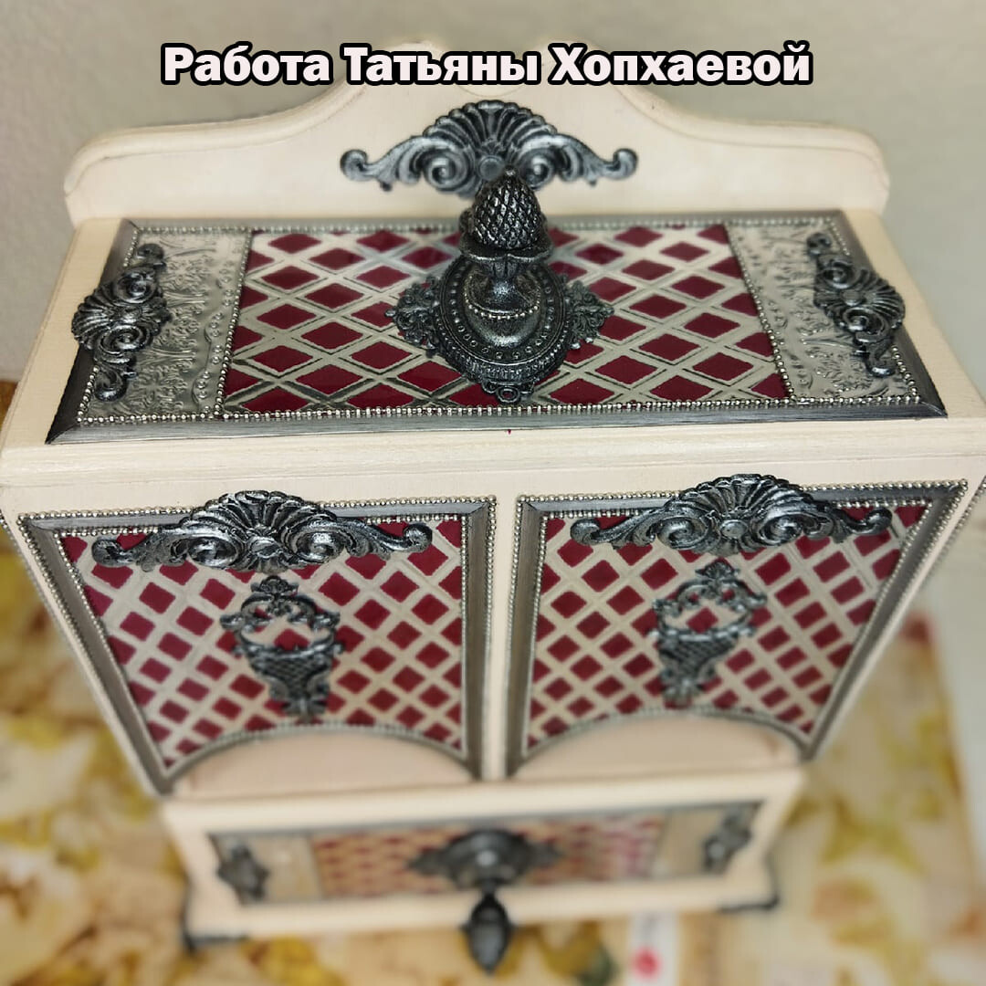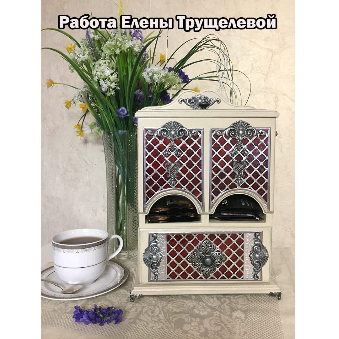 Декорируем наш любимый чайный буфетик. Дерево и сочетание благородного бардового цвета с серебром смотрятся очень нарядно. Данная работа подойдет для кухни в классическом стиле. Такой буфетик можно поставить не только в квартире, но и в офисе. Он будет радовать вас долгие годы и вызывать восхищение у ваших родных и знакомых! Красивые, качественно выполненные работы для чая отлично продаются! Это замечательный подарок на все случаи жизни!