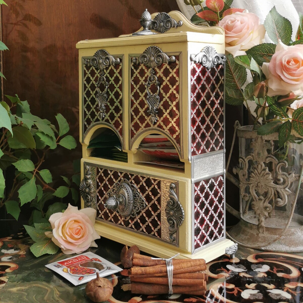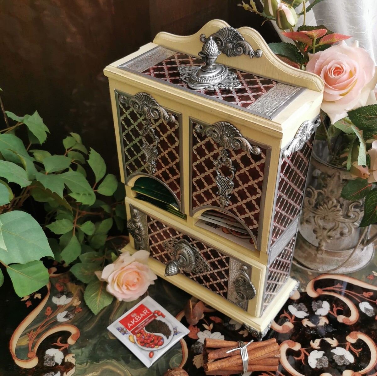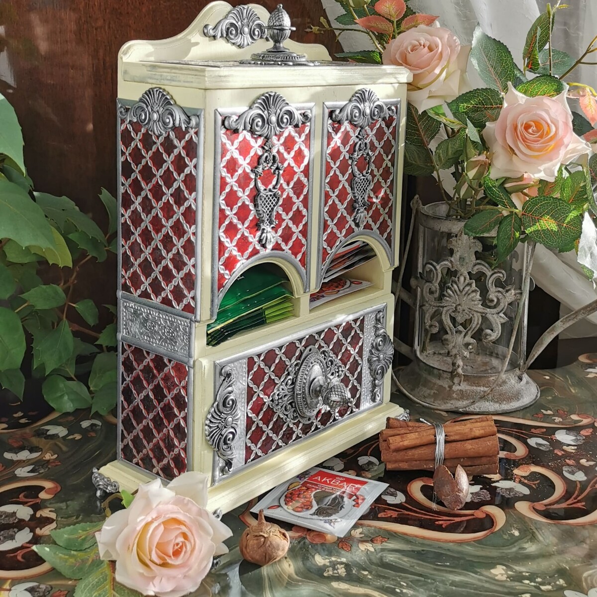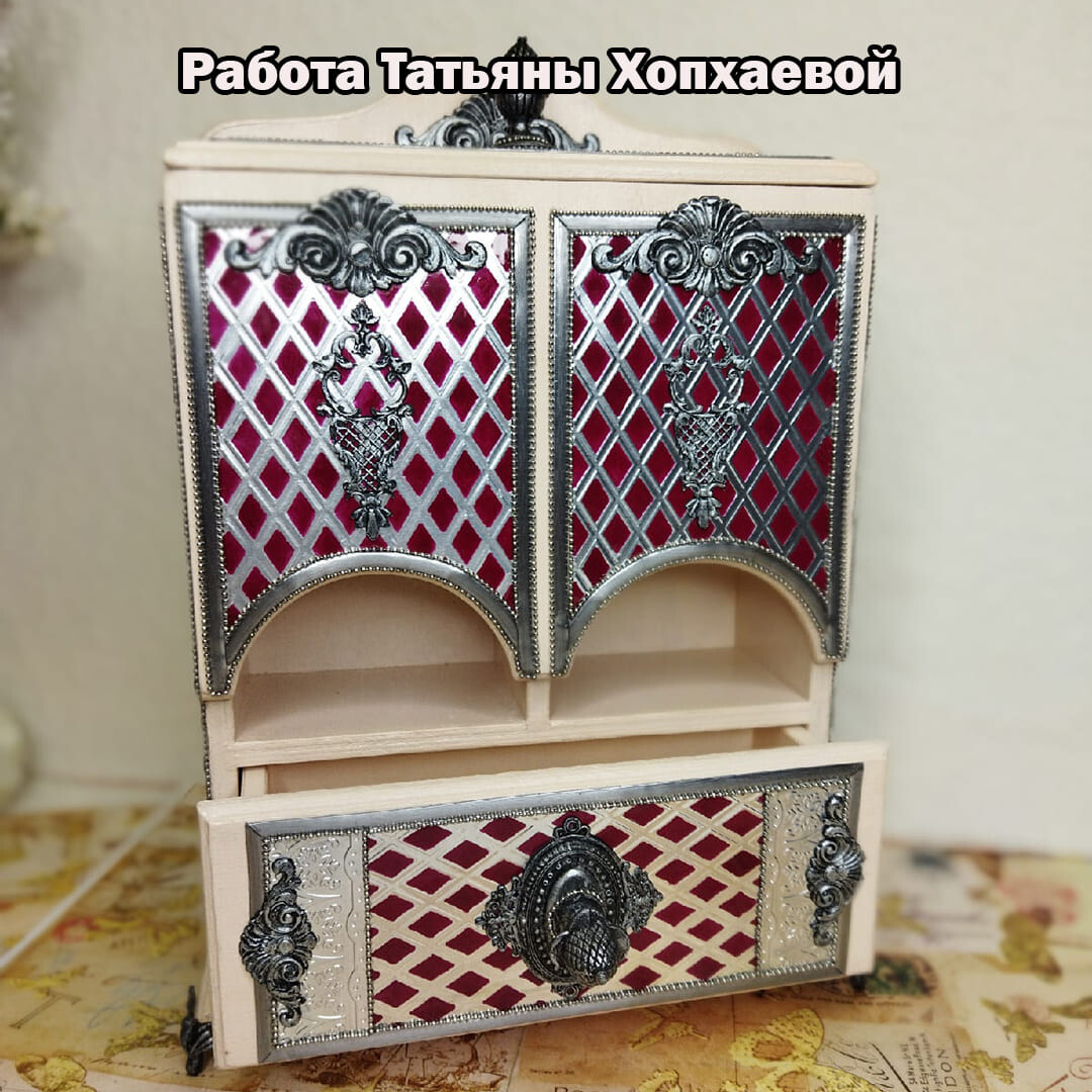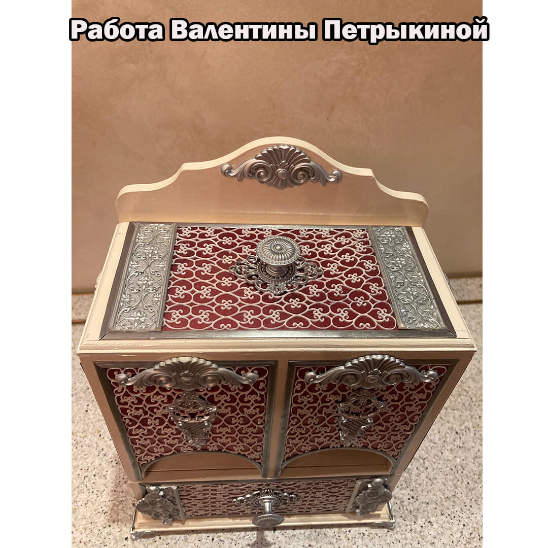Декорируем наш любимый чайный буфетик. Дерево и сочетание благородного бардового цвета с серебром смотрятся очень нарядно. Данная работа подойдет для кухни в классическом стиле. Такой буфетик можно поставить не только в квартире, но и в офисе. Он будет радовать вас долгие годы и вызывать восхищение у ваших родных и знакомых! Красивые, качественно выполненные работы для чая отлично продаются! Это замечательный подарок на все случаи жизни!