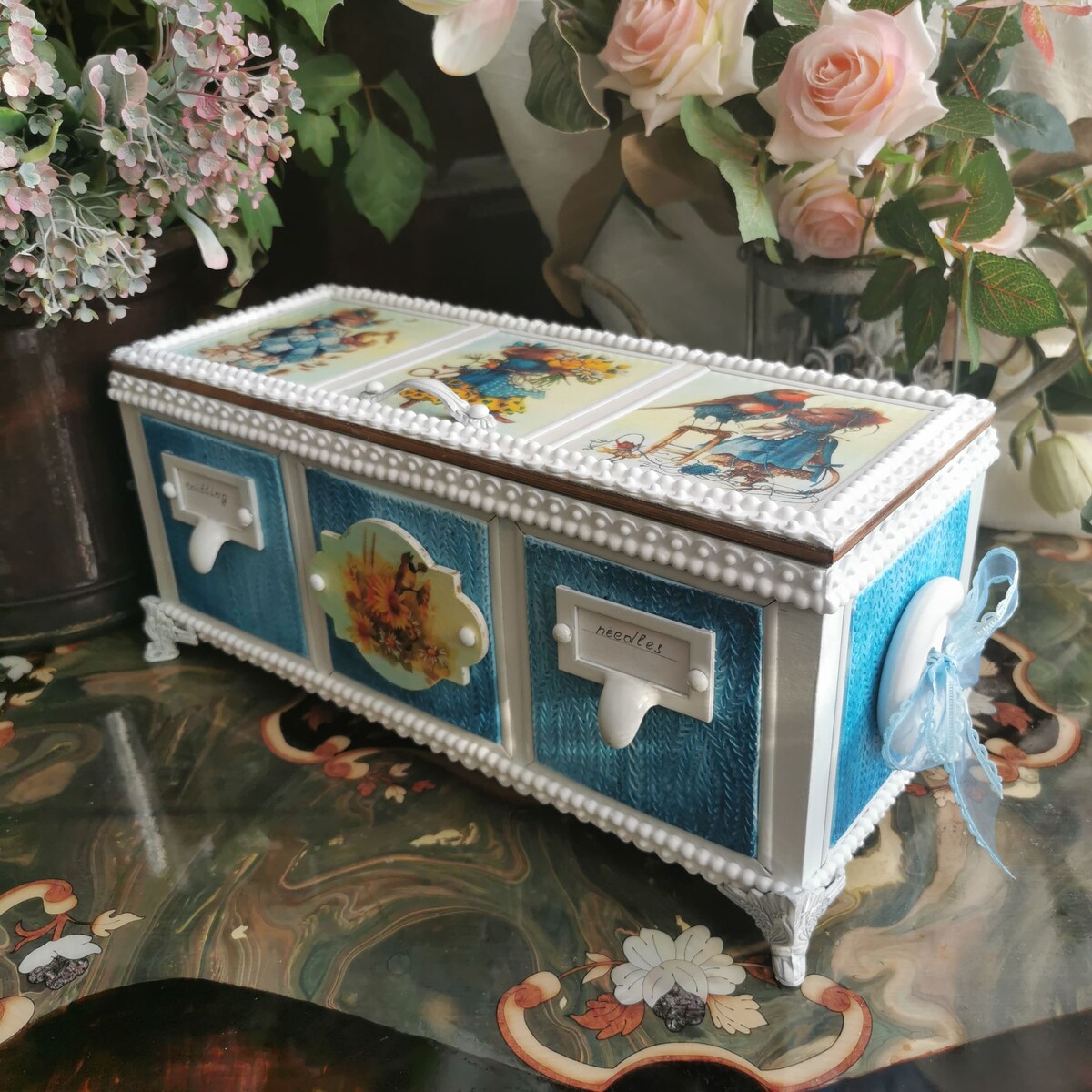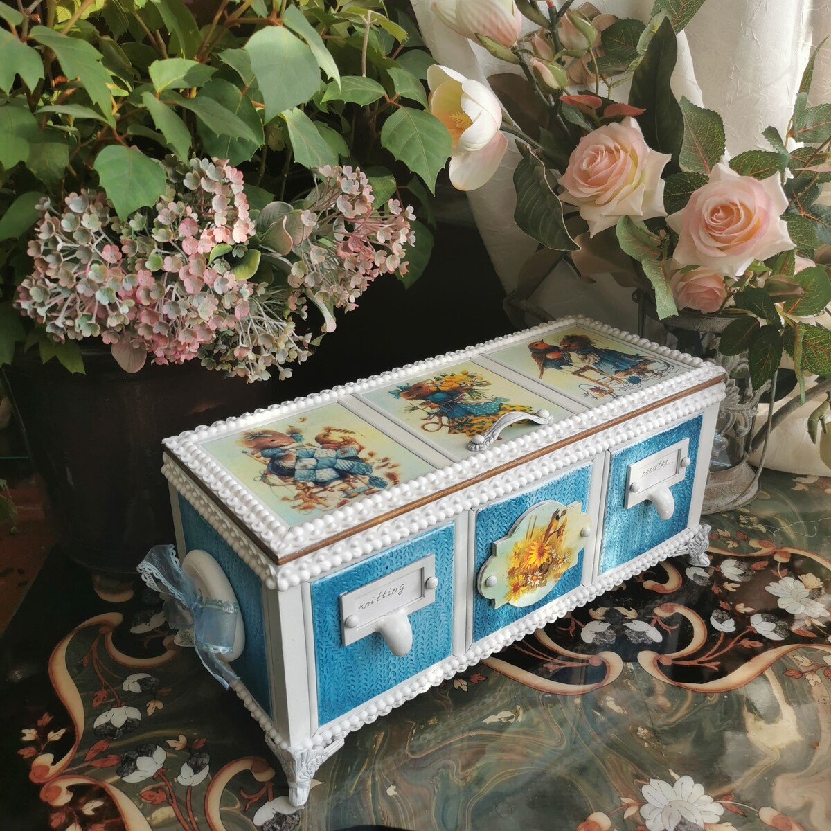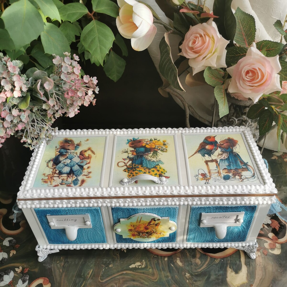 Для его воплощения я взяла заготовку, в которой уместятся спицы, клубочки, ниточки, ленточки и многое другое.