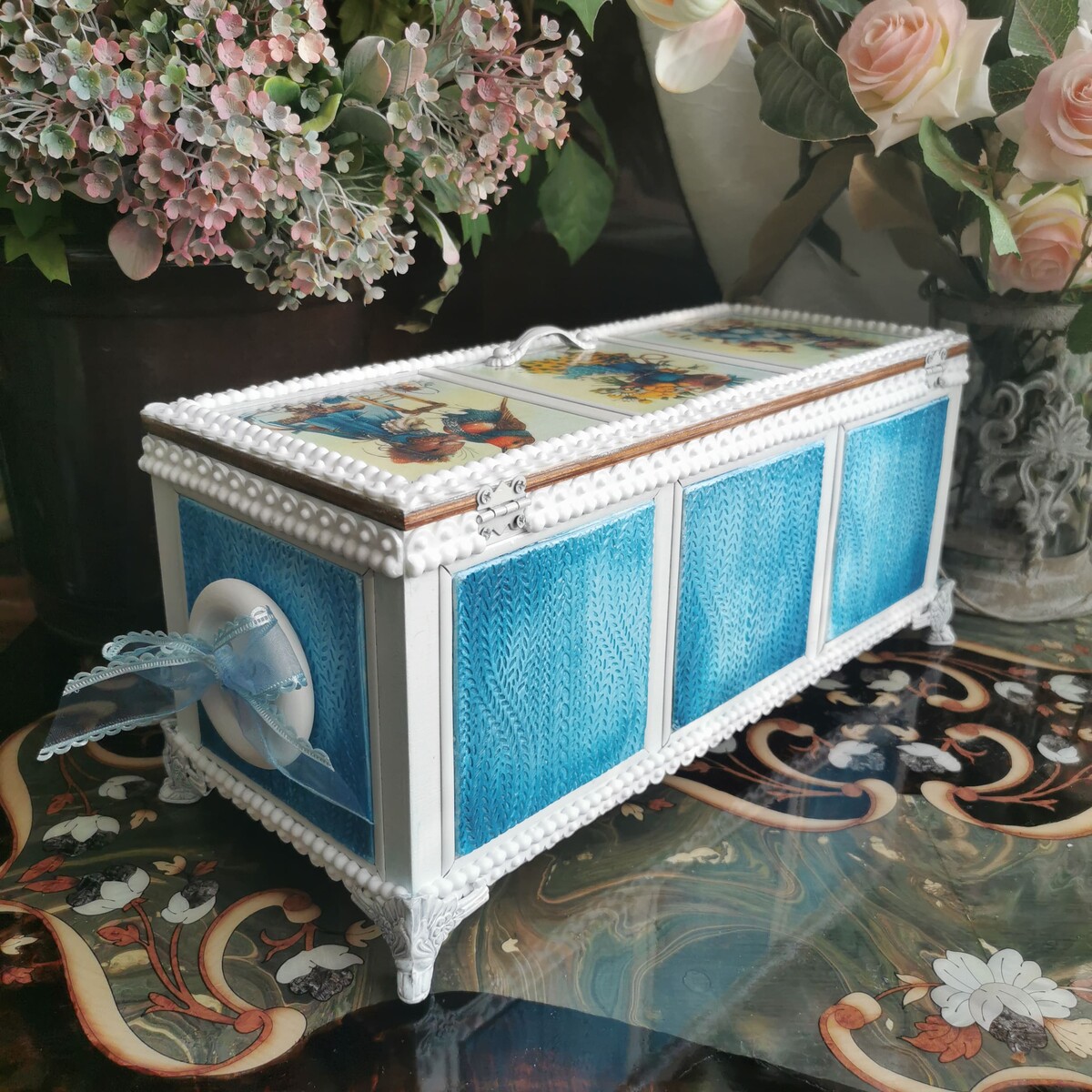 - как сделать оригинальную оборку из полубусин по краю короба;